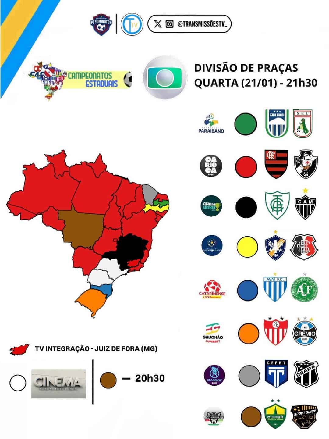 O duelo entre Serra Branca e Sousa pelo Campeonato Paraibano será transmitido para a Paraíba. No Rio de Janeiro, o clássico Flamengo e Vasco será exibido para diversos estados, incluindo Acre, Alagoas, Amapá, Amazonas, Bahia, Espírito Santo, Goiás, Maranhão, Mato Grosso do Sul, Pará, Piauí, Rio Grande do Norte, Rondônia, Roraima, Sergipe, Tocantins, Distrito Federal e a cidade mineira de Juiz de Fora.