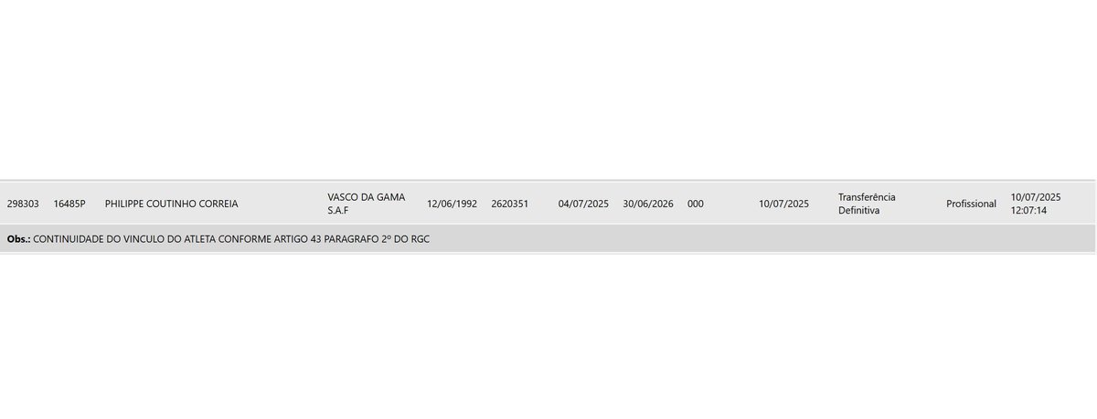 A rescisão de Philippe Coutinho ainda não foi registrada no Bira da Ferj e no BID da CBF.