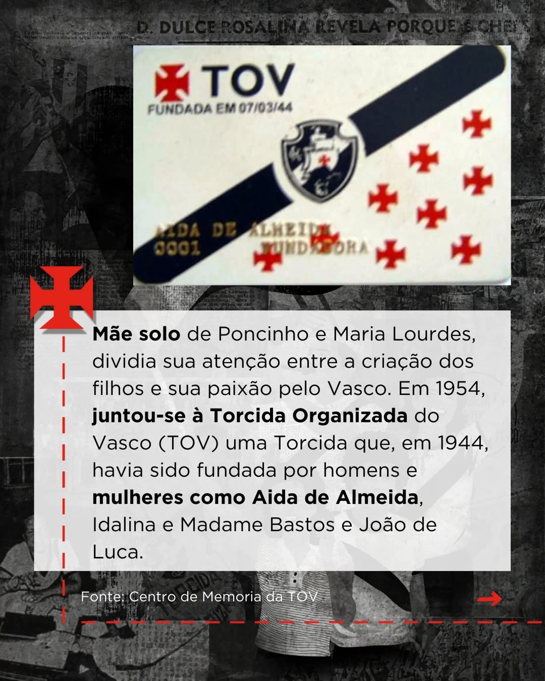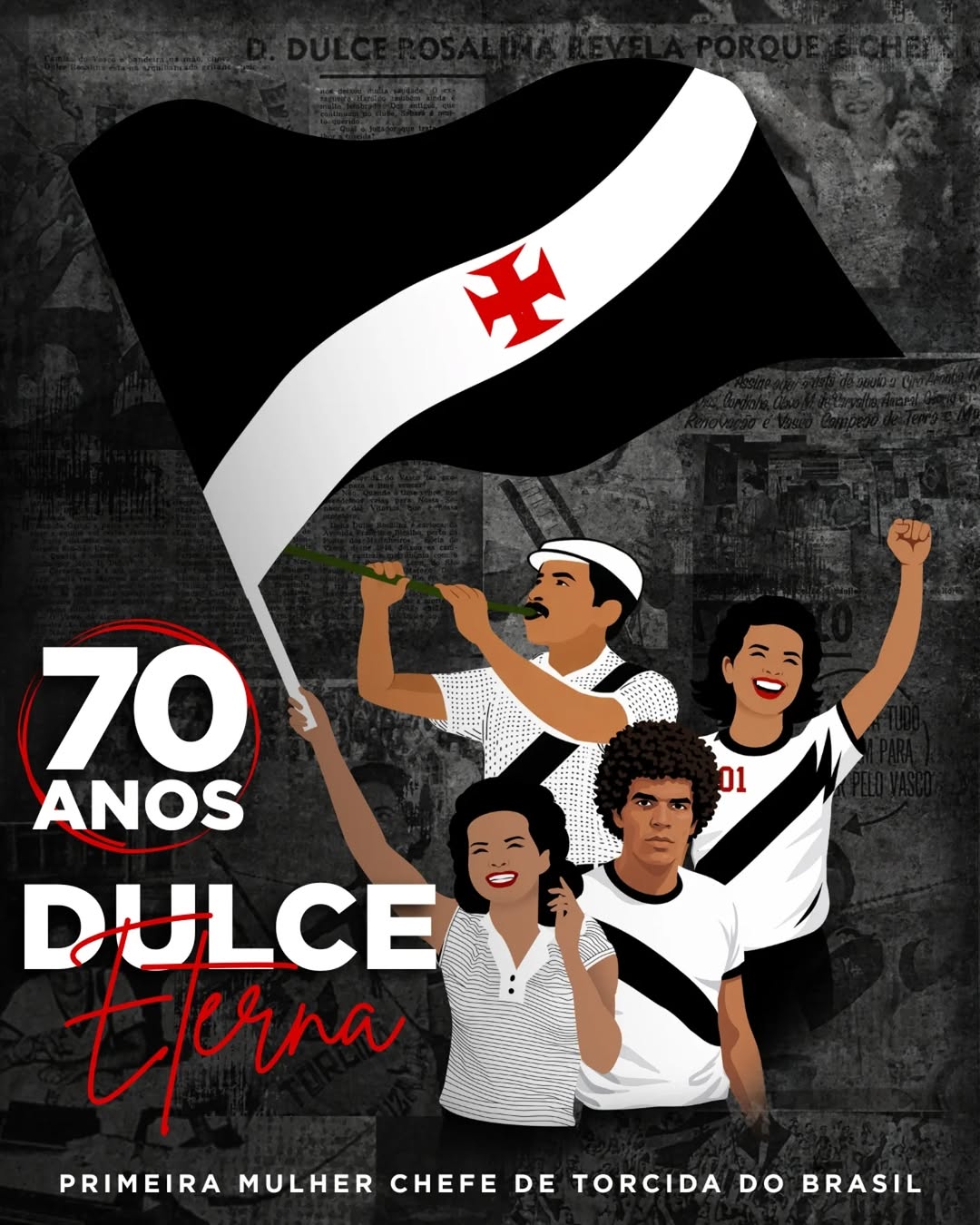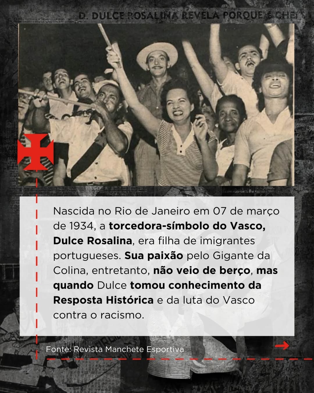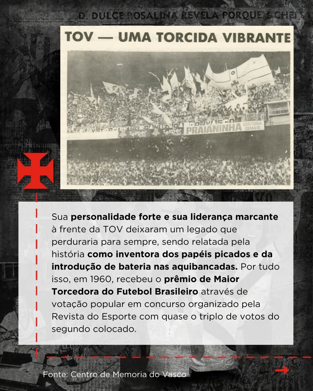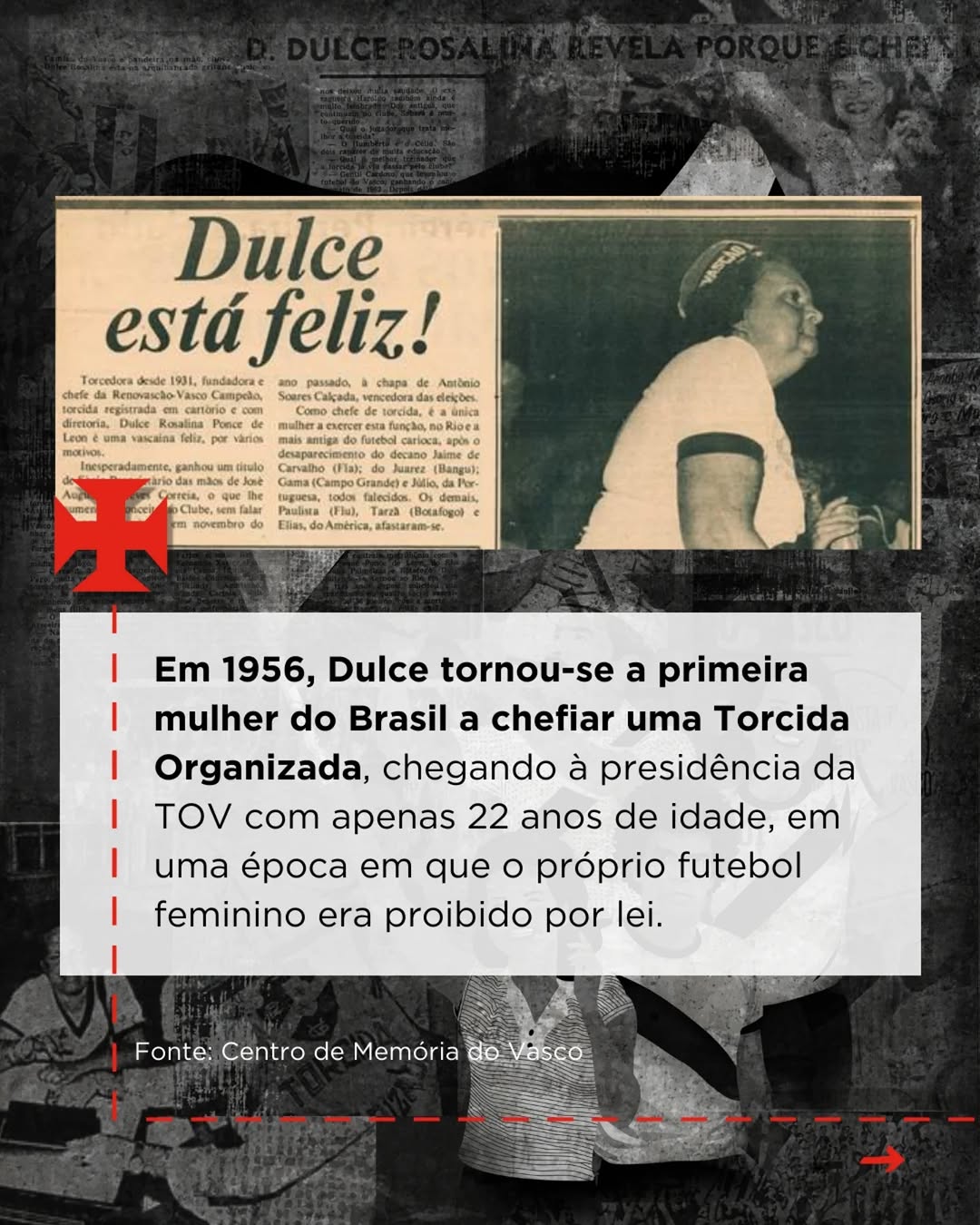 Celebramos 70 anos de história, coragem e pioneirismo. Hoje homenageamos Dulce Rosalina, a primeira mulher a liderar uma torcida organizada no Brasil. Em 1956, ela desafiou o machismo à frente da Torcida Organizada do Vasco (TOV), abrindo portas para muitas mulheres no futebol.