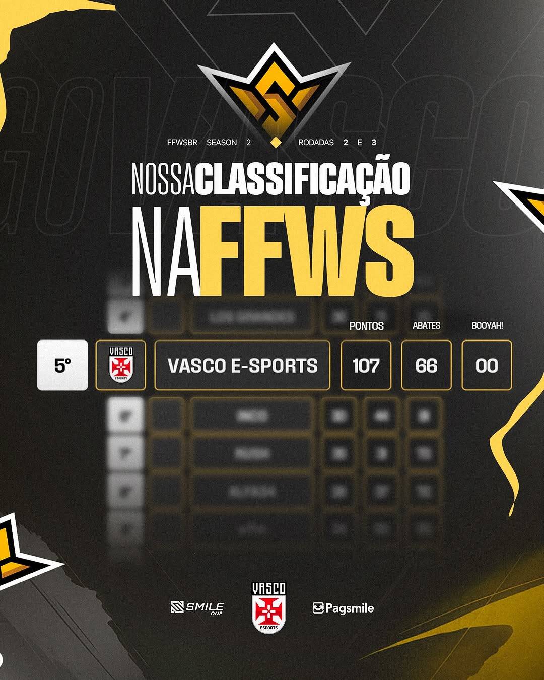 Atualmente, a tabela da #ffwsbr apresenta o Vasco em 5º lugar, acumulando 107 pontos e 66 abates em 12 quedas.