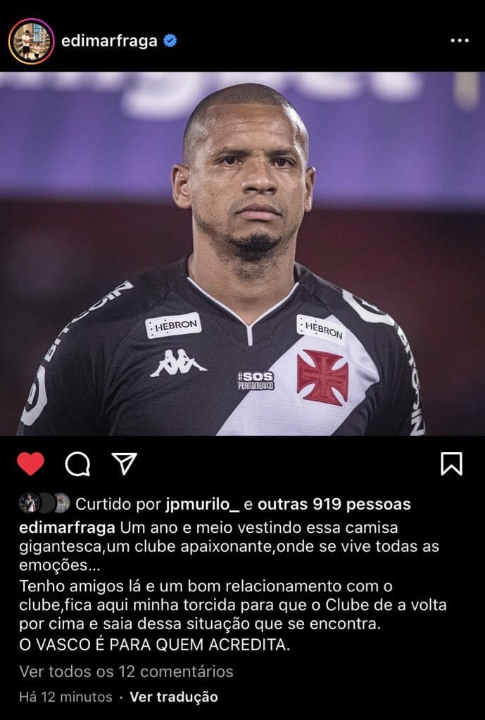 Edimar demonstra solidariedade ao Vasco visando superar essa fase difícil no Campeonato Brasileiro.