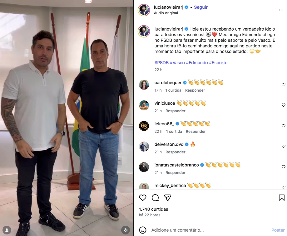– Hoje estou recebendo um verdadeiro ídolo para todos os vascaínos! Meu amigo Edmundo chega no PSDB para fazer muito mais pelo esporte e pelo Vasco. É uma honra tê-lo caminhando comigo aqui no partido neste momento tão importante para o nosso estado – afirmou.