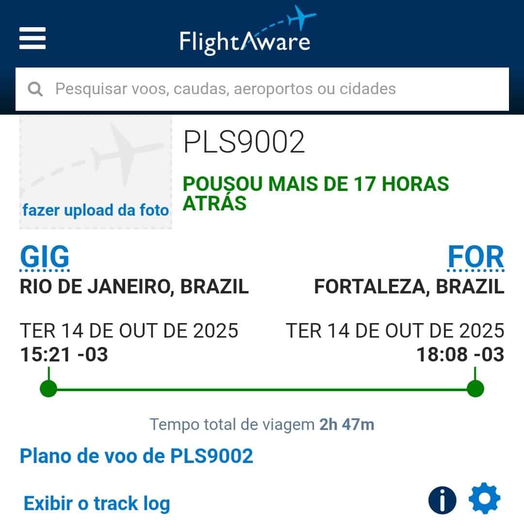 A decolagem aconteceu às 15h21 e o pouso foi registrado às 18h08 na capital do Ceará.