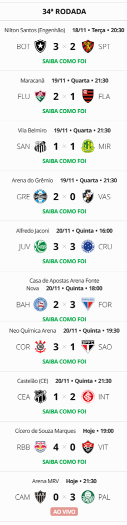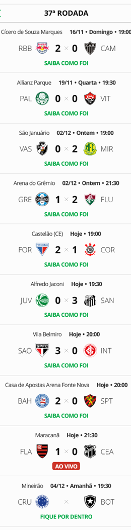 A quarta-feira trouxe não apenas os confrontos da 37ª rodada, mas também duas partidas pendentes da 34ª rodada. O Vasco se prepara para a última partida do Campeonato Brasileiro ocupando a 12ª posição, garantindo sua segurança contra o rebaixamento, mas sem possibilidades de classificar-se para a Libertadores. No entanto, a equipe continua na disputa por um lugar na Copa Sul-Americana.