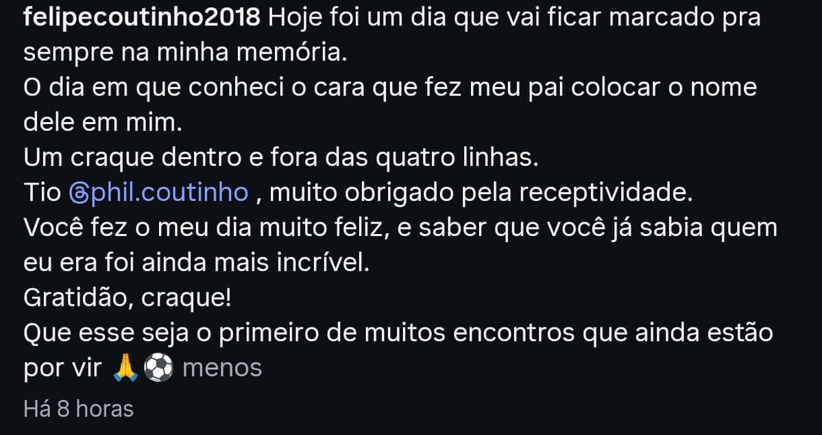 O jovem Felipe Coutinho, atleta da base do Vasco, teve a oportunidade de conhecer o renomado jogador Philippe Coutinho, que também tem uma história ligada ao clube. O encontro foi um momento especial para o jovem, que se destacou nas categorias de base.