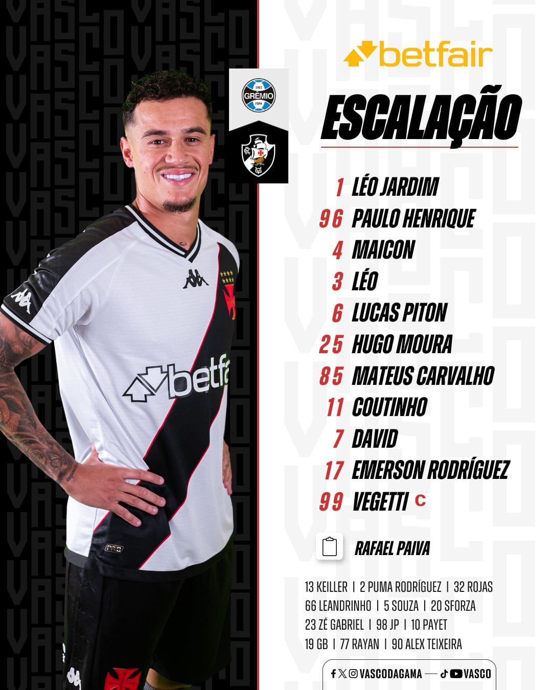 Vasco definido. Coutinho começa jogando, Emerson Rodríguez entra no lugar de Adson.