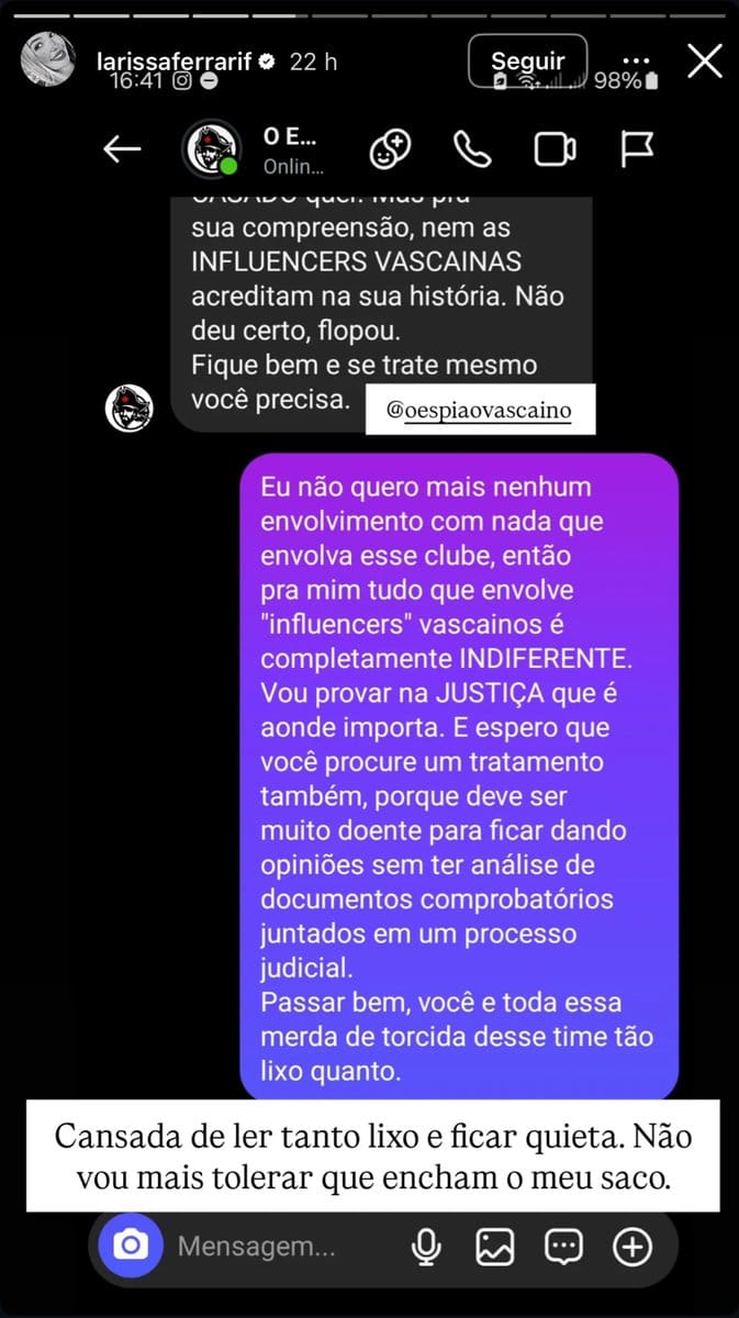 Ela ainda se referiu à torcida do Vasco como “lixo”.
