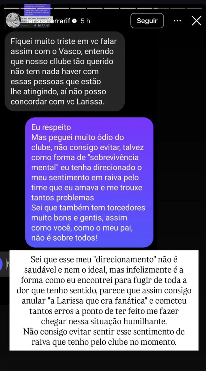 Larissa Ferrari, uma suposta torcedora do Vasco e ex-parceira de Payet, fez uma declaração polêmica sobre o clube: “Eu quero que caia, que se rebaixe mais mil vezes”.