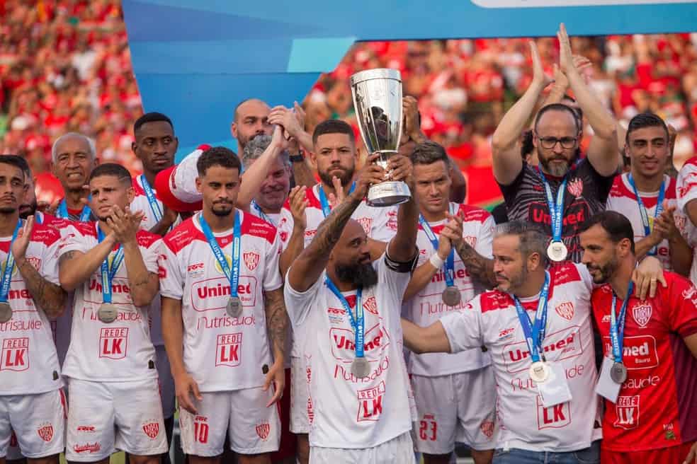 Luizão levanta taça de vice-campeão da Série A2 2024, pelo Noroeste — Foto: Thomaz Marostegan/Ag.Paulistão