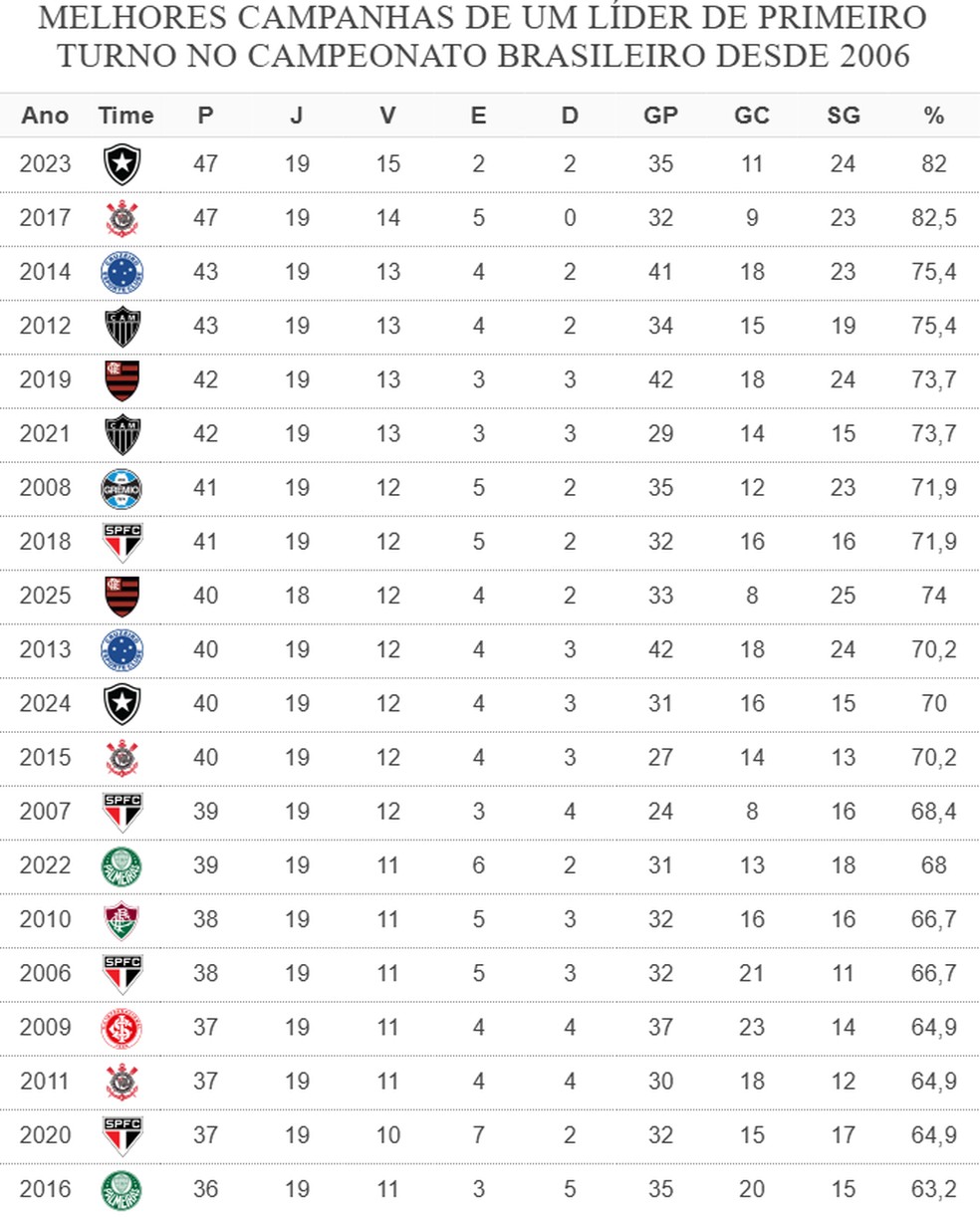 Melhores campanhas de um líder do primeiro turno do Brasileirão desde 2006 — Foto: Gato Mestre
