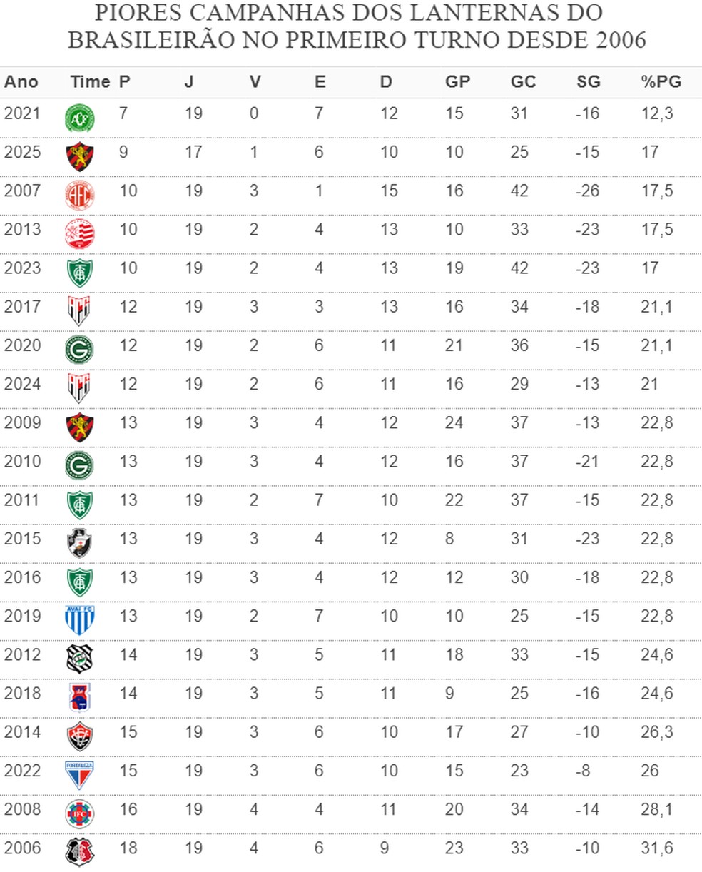 Confira os piores desempenhos de um lanterna de 1º turno do Brasileirão desde 2006: