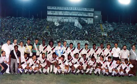 Elenco do Vasco da Gama reunido em São Januário com a faixa no peito referente à conquista do título brasileiro de 1989. Em pé estão membro da comissão técnica, Ademar Braga, o técnico Nelsinho Rosa, Acácio, Márcio, Marco Aurélio, Quiñonez, Régis, dois jogadores não identificados, Oliveira, Ayupe, Andrade, Célio Silva, Luiz Carlos Winck, dois dirigentes e Eurico Miranda. Agachados estão outro membro da comissão técnica não identificado, Alcir Portela, Zé do Carmo, Tita, Vivinho, jogador não identificado, Sorato, outro jogador não identificado, Boiadeiro, Mazinho, Sony Anderson, Tato, Bismarck, William e Cássio