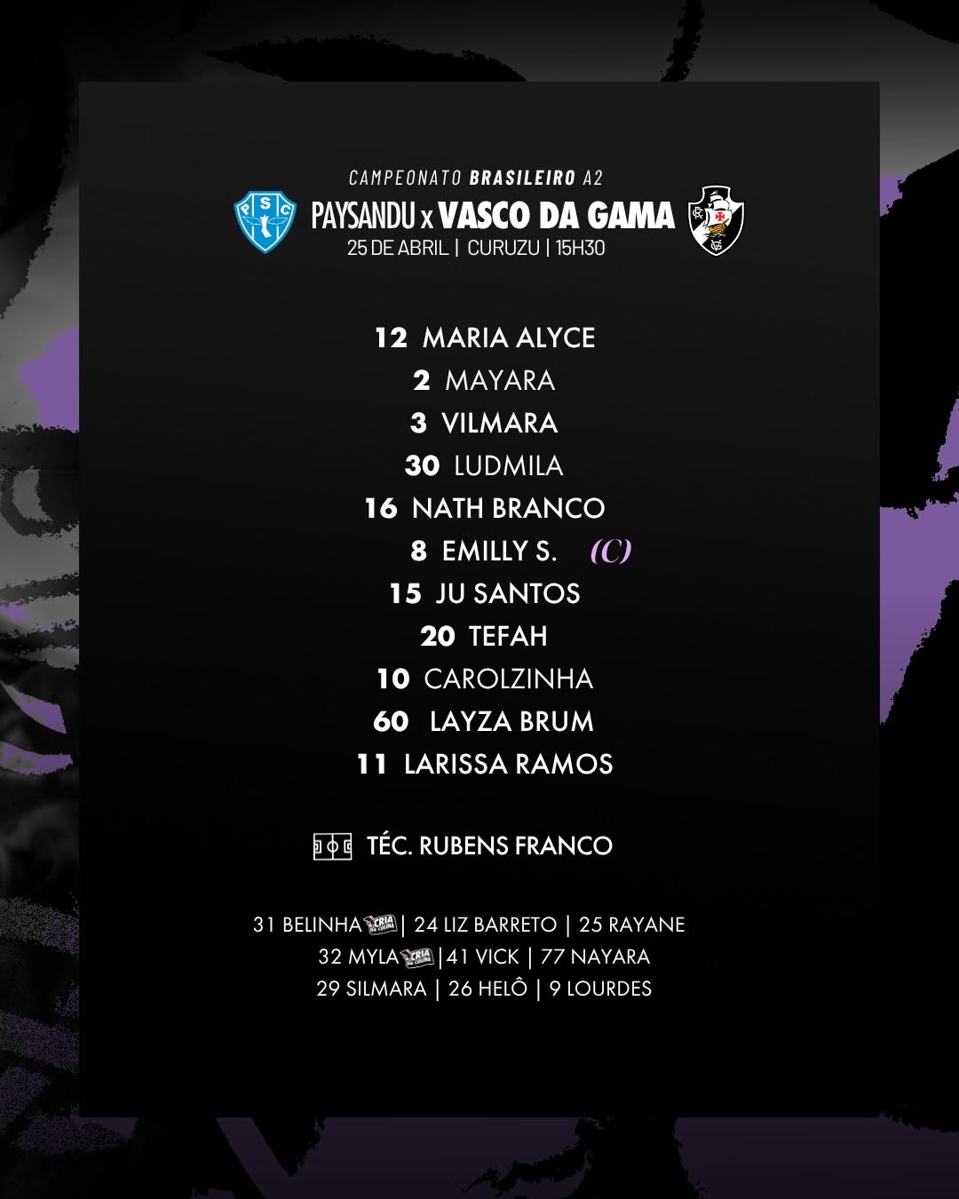Vasco divulga a escalação da equipe feminina para o confronto contra o Paysandu