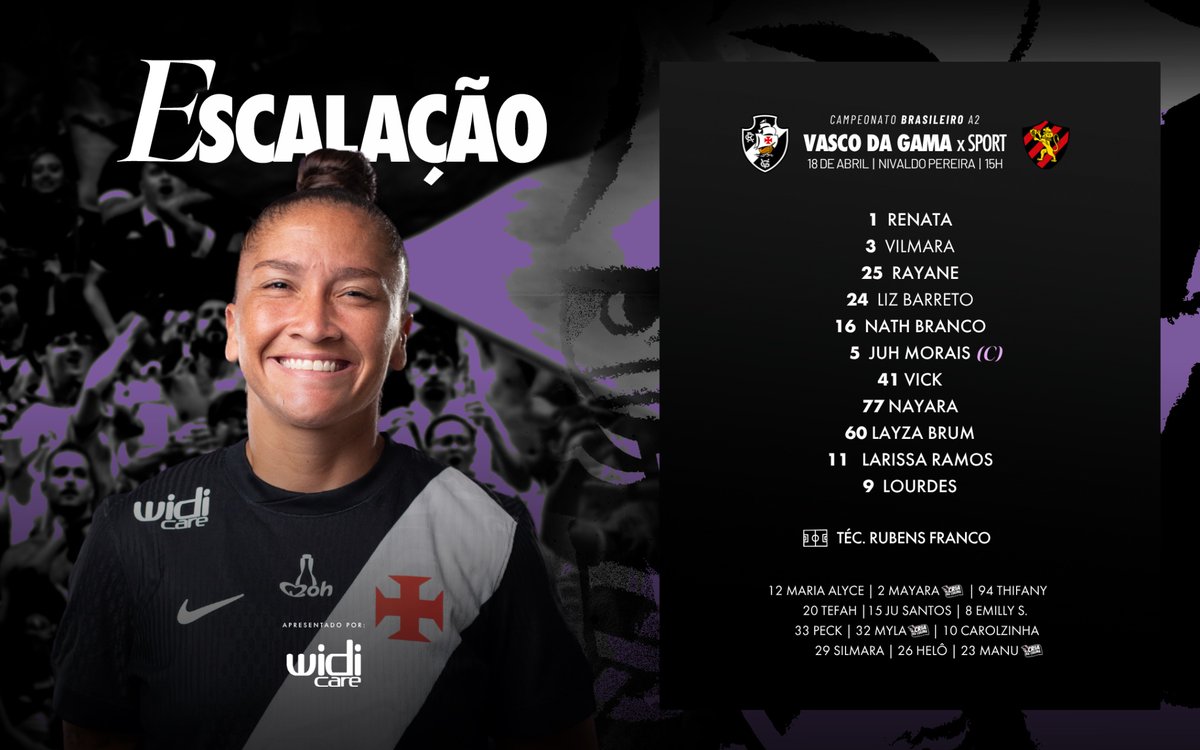 O Vasco Feminino divulgou, por meio de suas redes sociais, a escalação para a partida contra o Sport Recife. As Meninas da Colina estão prontas para entrar em campo no Campeonato Brasileiro Feminino A2.