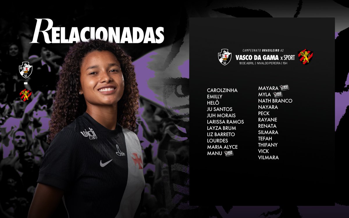 O Vasco Feminino divulgou a lista de jogadoras relacionadas para o confronto contra o Sport, válido pelo Campeonato Brasileiro Feminino A2. A partida promete ser um importante desafio para as Meninas da Colina.