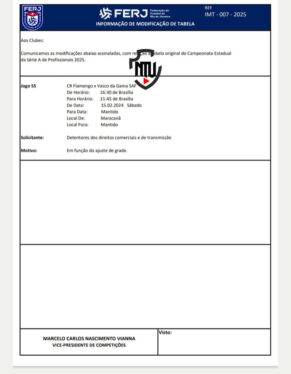 FERJ MODIFICA O HORÁRIO DO CLÁSSICO ENTRE VASCO E FLAMENGO