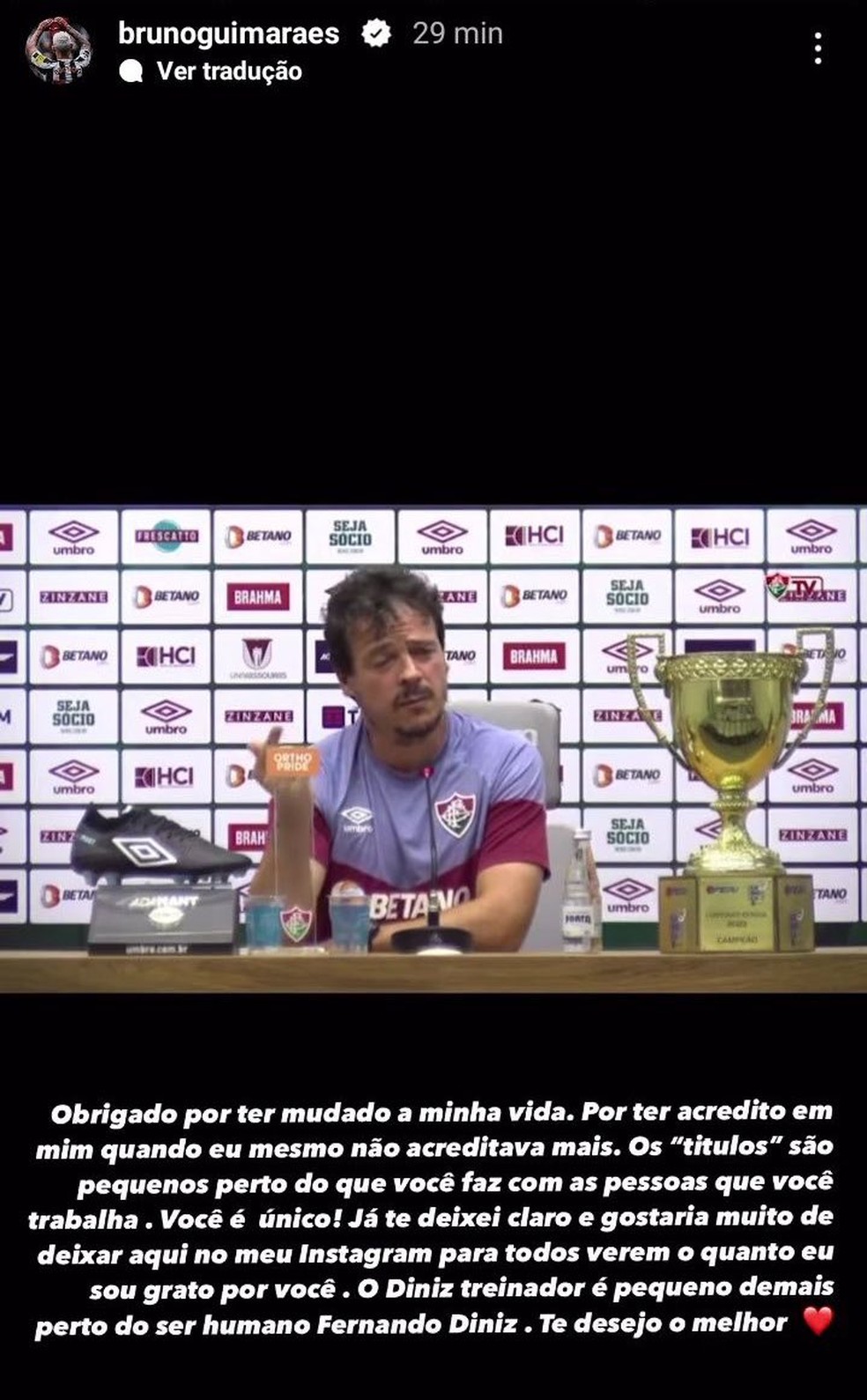 Bruno Guimarães postou agradecimento público a Fernando Diniz — Foto: Reprodução / Instagram