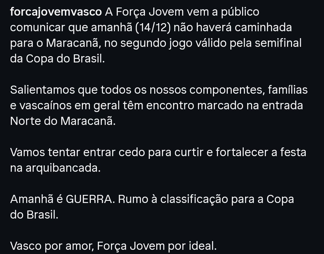 ATENÇÃO! A Força Jovem divulgou um comunicado informando que a caminhada da torcida para o clássico no Maracanã não acontecerá.