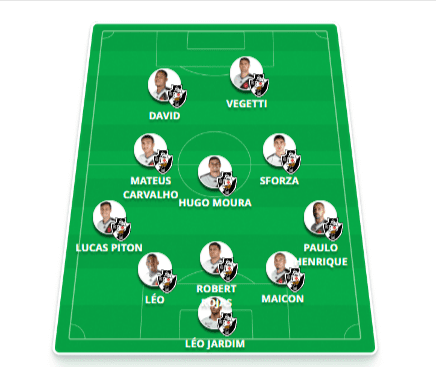 Provável escalação do Vasco: Léo Jardim, Paulo Henrique, Rojas, Maicon, Léo, Lucas Piton, Sforza, Hugo Moura, Mateus Cocão, David e Vegetti.