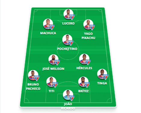 Provável escalação do Fortaleza: João Ricardo, Tinga, Britez, Titi, Bruno Pacheco; Zé Welison, Hércules, Pochettino; Pikachu, Machuca e Lucero.