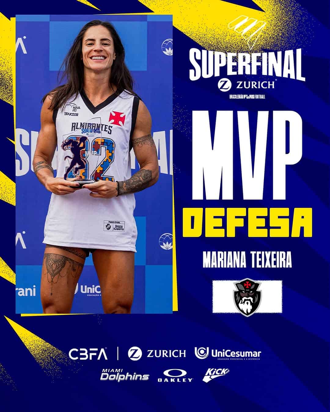 Mariana Teixeira, do @vascoalmirantes, foi nomeada a MVP de Defesa da temporada 2025 do Brasileirão de Flag. A premiação ocorreu durante a Superfinal feminina de Flag Football que aconteceu no último fim de semana. 🟢🟡🇧🇷
