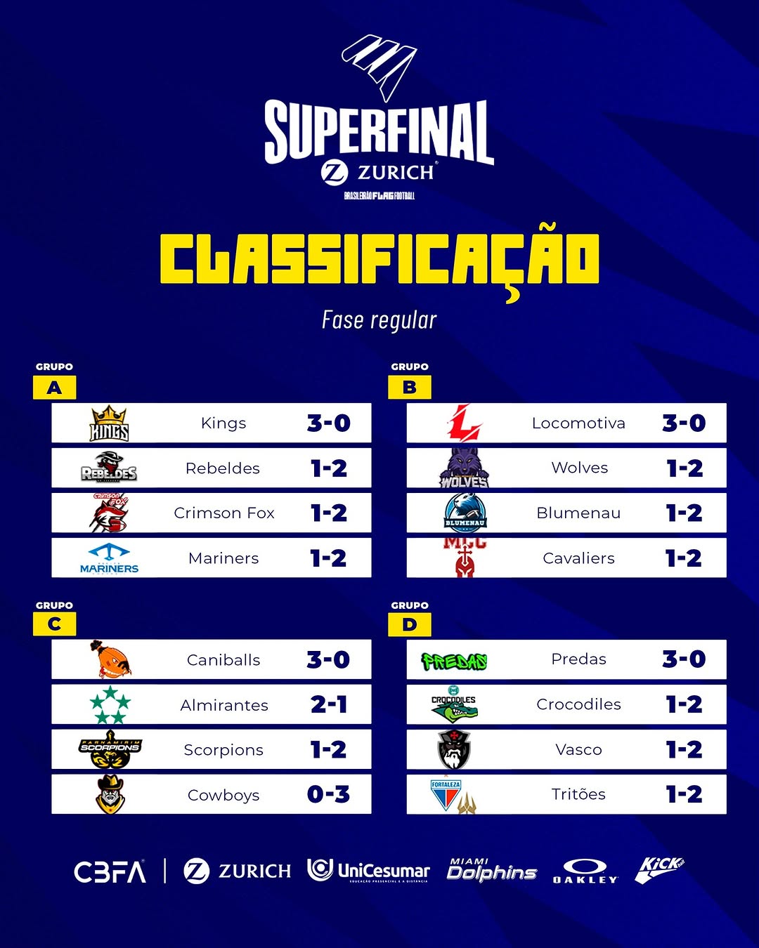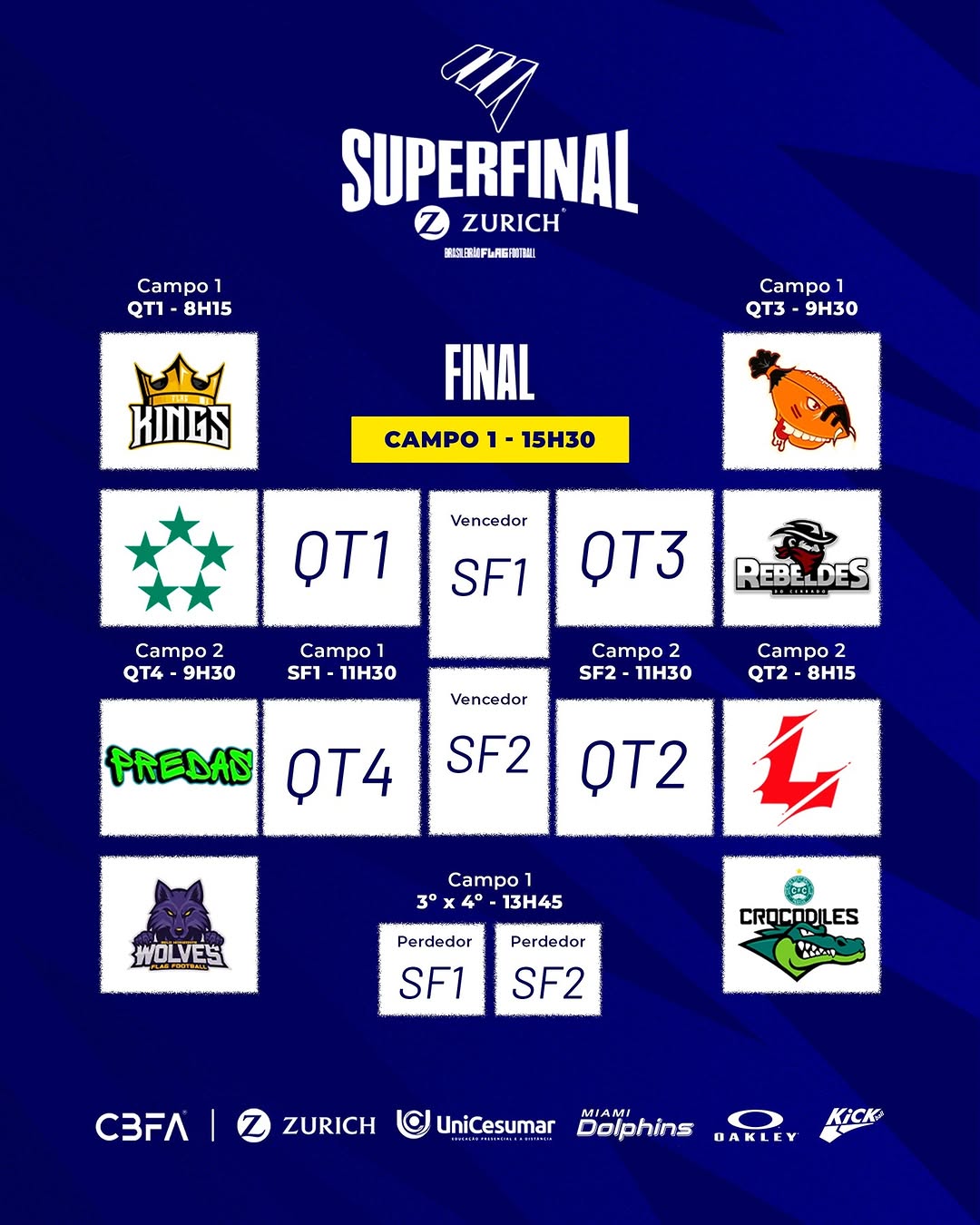 A fase regular da Superfinal masculina de Flag Football foi concluída! Os confrontos eliminatórios já estão definidos e acontecerão amanhã, a partir das 8h15. Acompanhe as emoções com @cbfaoficial.