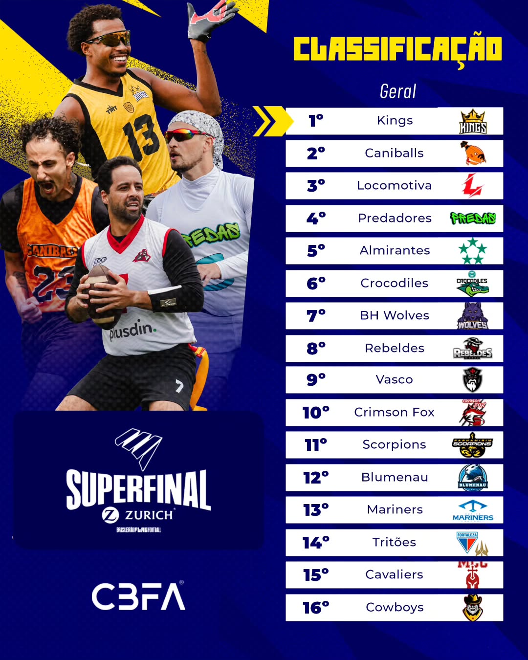 Confira a classificação geral da Superfinal masculina de Flag Football promovida pela @brasileiraoflag, com apoio da @zurichnobrasil.