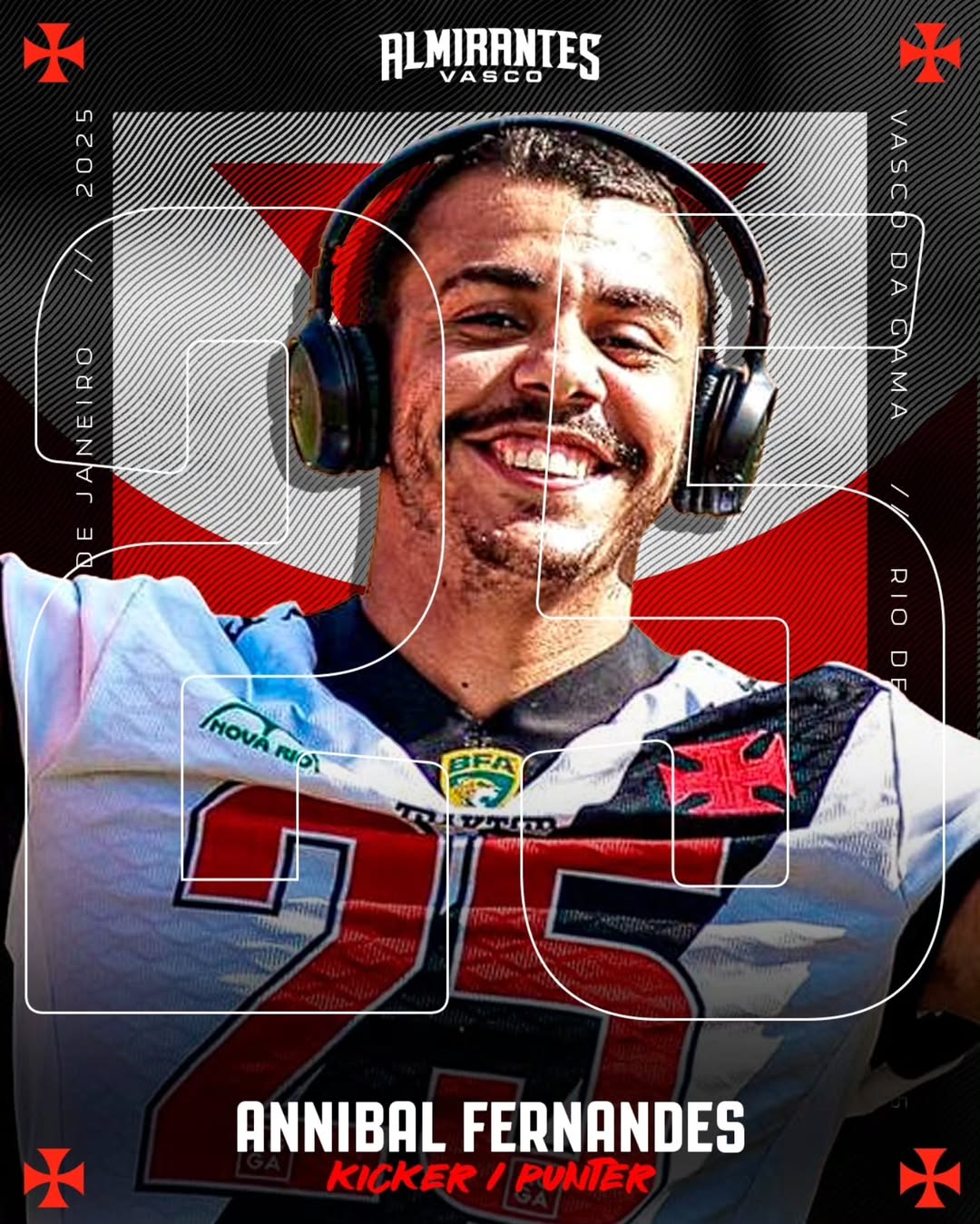 Annibal retorna ao Vasco como kicker e punter para a temporada de 2025! O atleta, que teve um desempenho impecável com 100% de aproveitamento em Field Goals e extra points em sua passagem em 2023, já conquistou o título carioca com o Vasco em 2019.