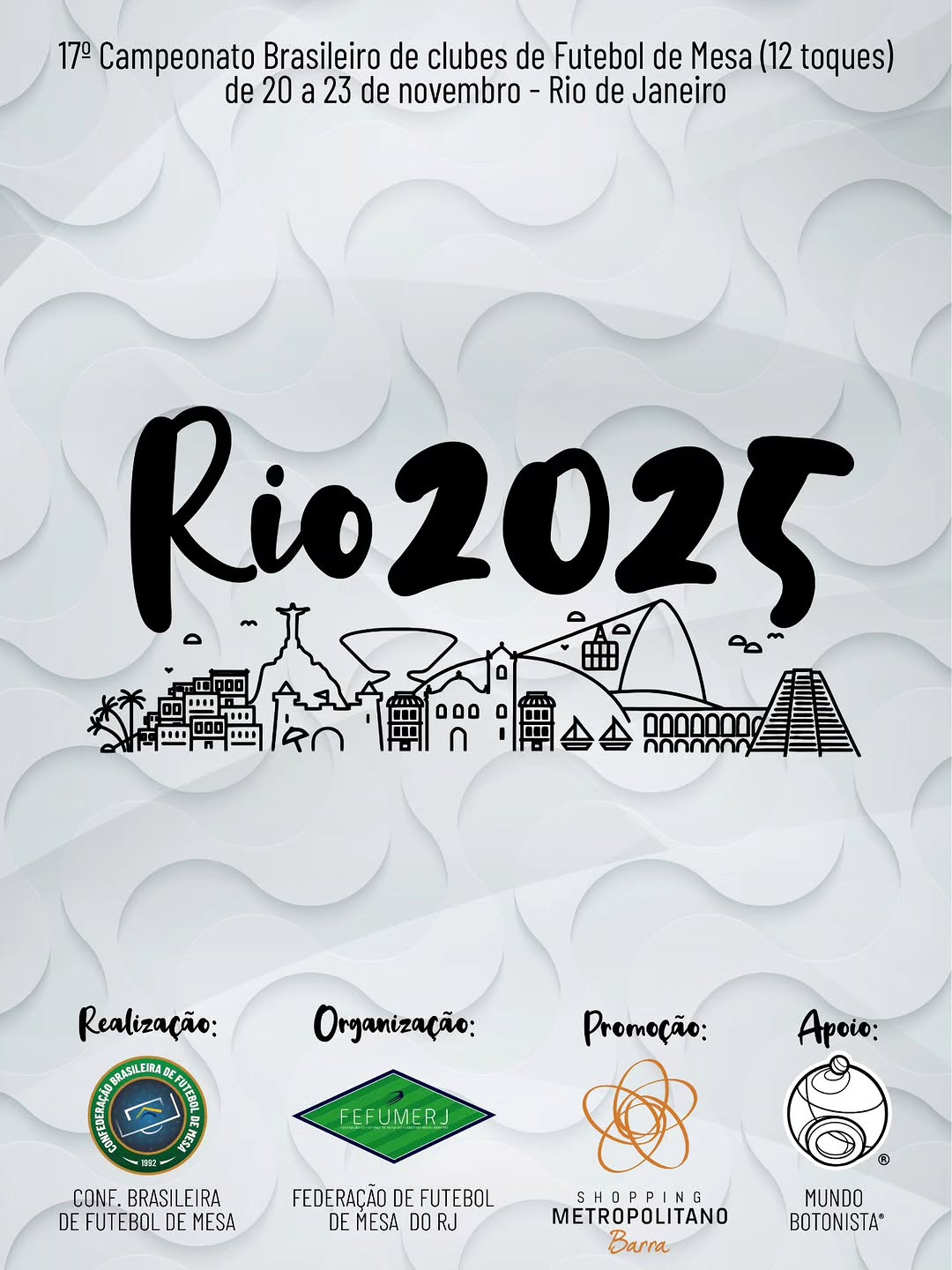 Entre 20 e 23 de novembro de 2025, o Rio de Janeiro receberá o 17º Campeonato Brasileiro de Clubes de Futebol de Mesa – Regra 12 Toques, uma das competições mais tradicionais do país para equipes desta modalidade.