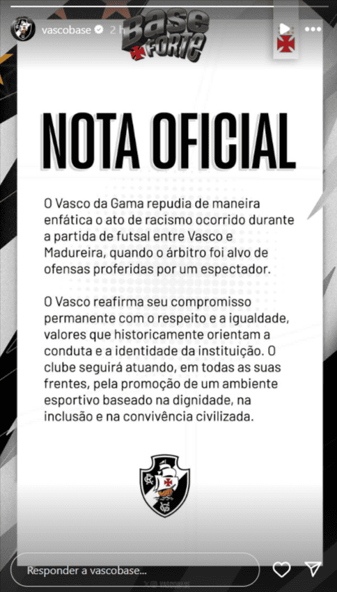 No último sábado, um incidente de racismo ocorreu durante a partida entre Madureira e Vasco no campeonato sub-10 da federação.