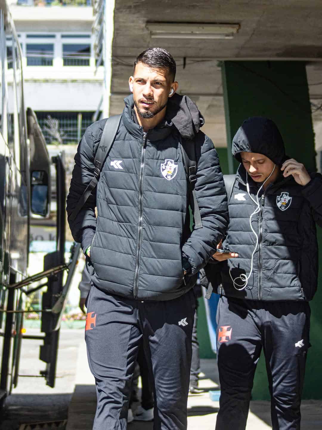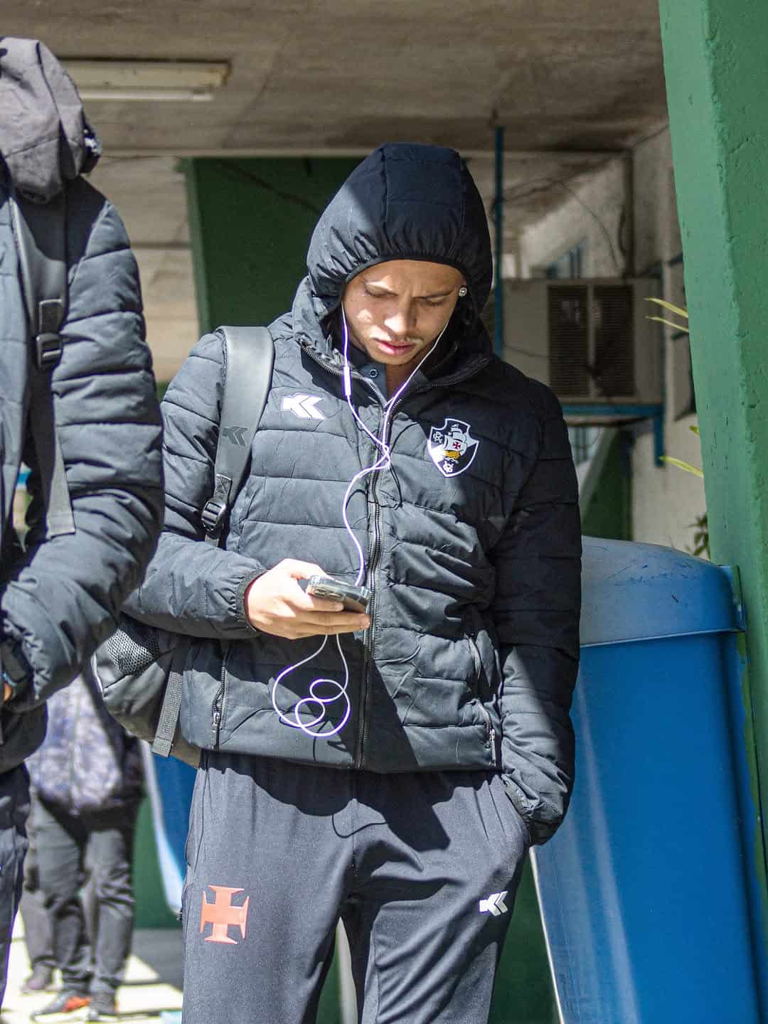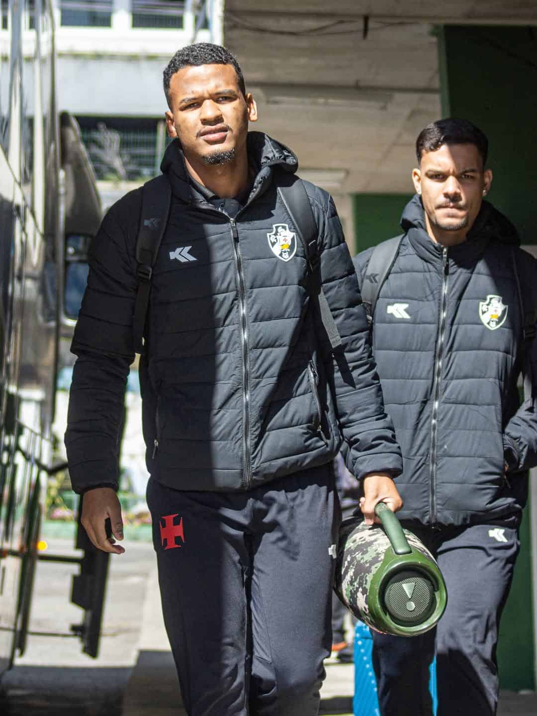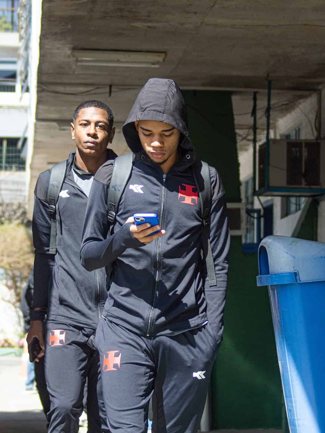 Nike kits com escudo do Vasco, dois jogadores caminhando juntos. Jovem atleta com jaqueta preta e mochila. Vestido de treino do Vasco da Gama em dias de jogo. Por favor, envie a imagem para que eu possa gerar as informações de SEO. Vasco vestindo jaqueta preta em ambiente externo. Vestido casual de jogador do Vasco, com jaqueta preta e shorts cinza. Jogador do Vasco com jaqueta preta e mochila preta. Vasca jovem com roupa esportiva e mochila preta. Vestido com jaqueta cinza e camiseta cinza, homem com capuz preto, mochila e expressão séria. Jogador do Vasco com mala de viagem. Vestuários do Vasco, dois jovens com roupas esportivas negras, um usando capuz, um deles olhando para o celular. Jaó jovem usando jaqueta preta com escudo do Vasco, mochila e carregando sacola.