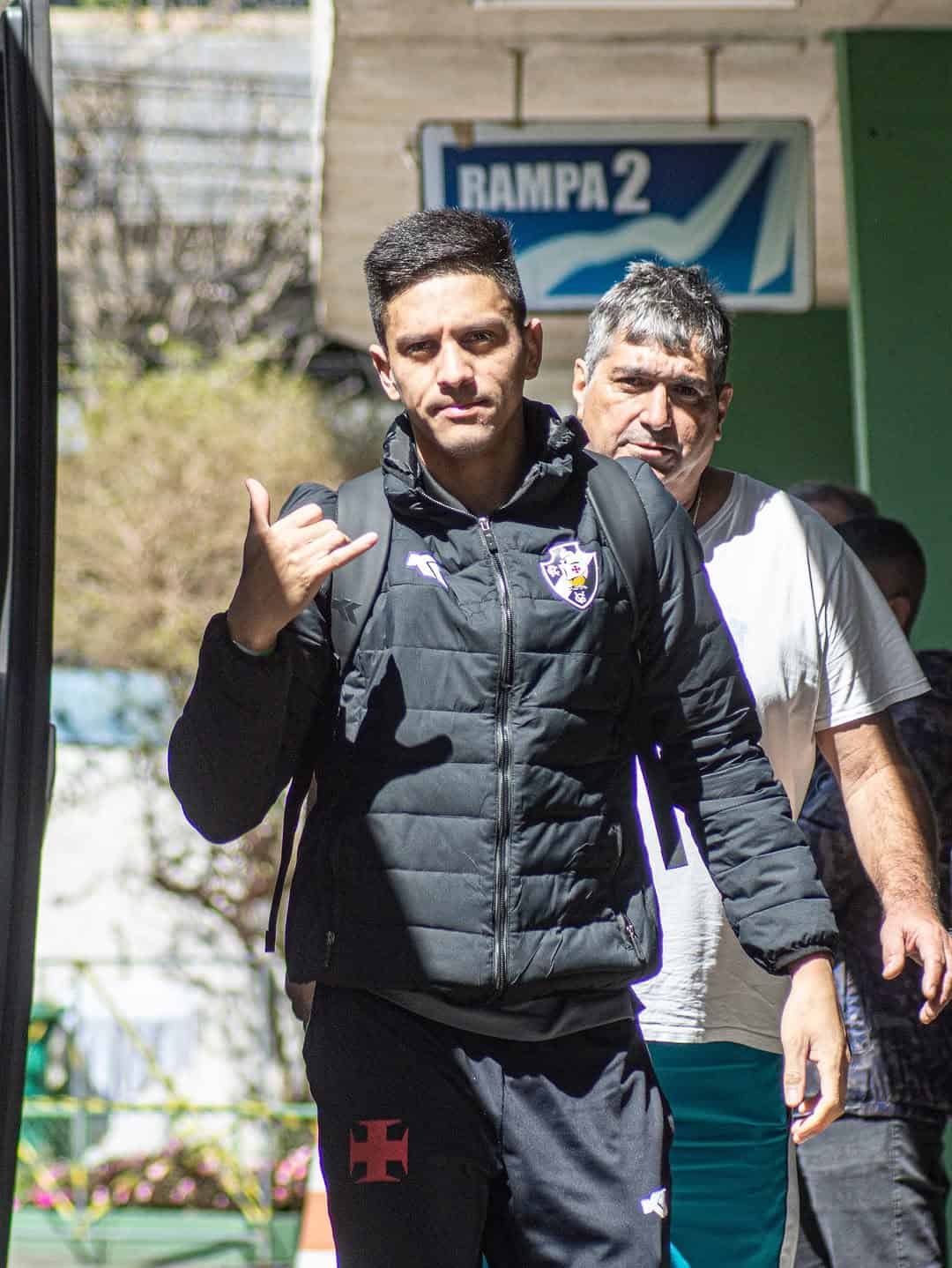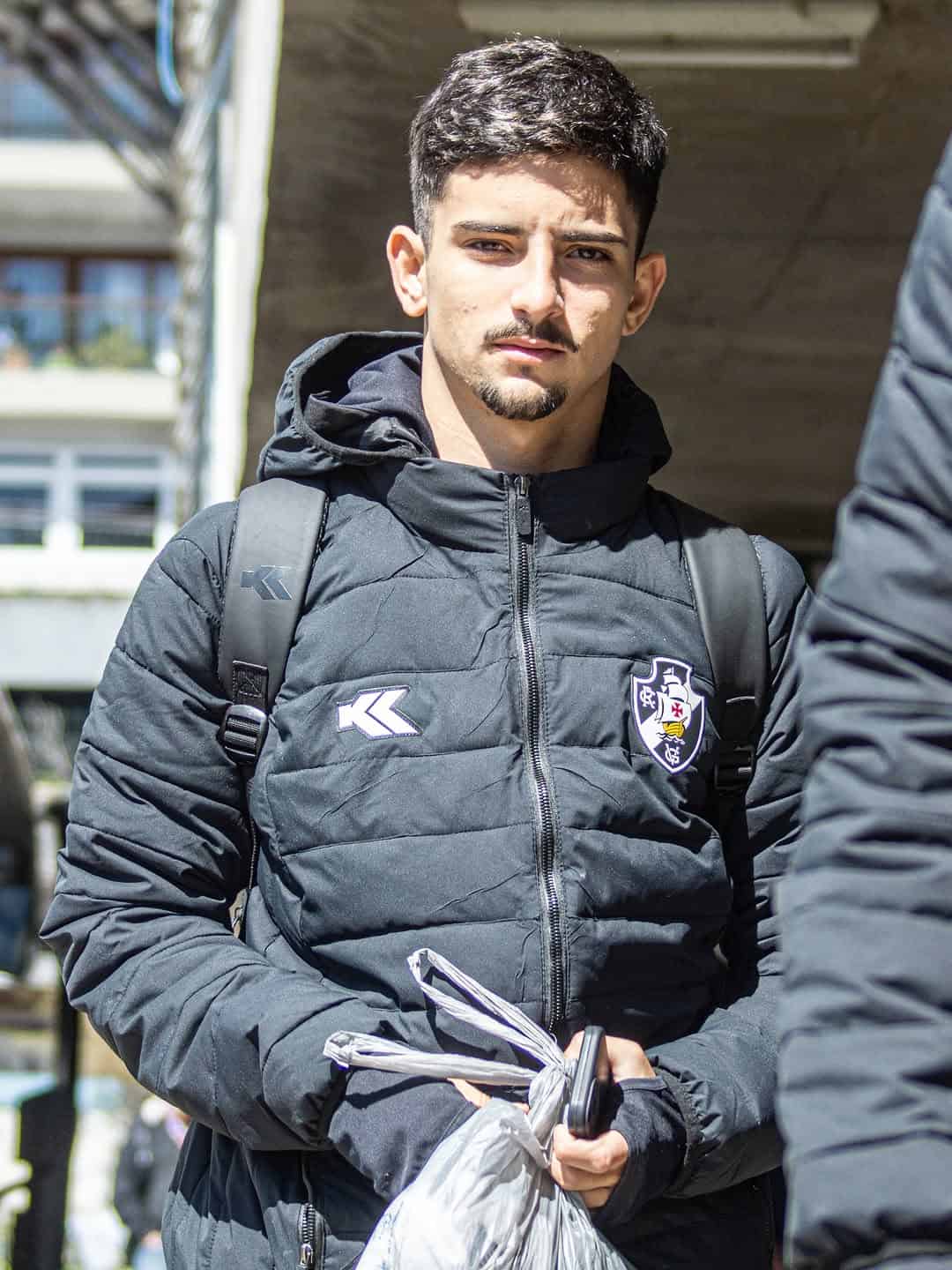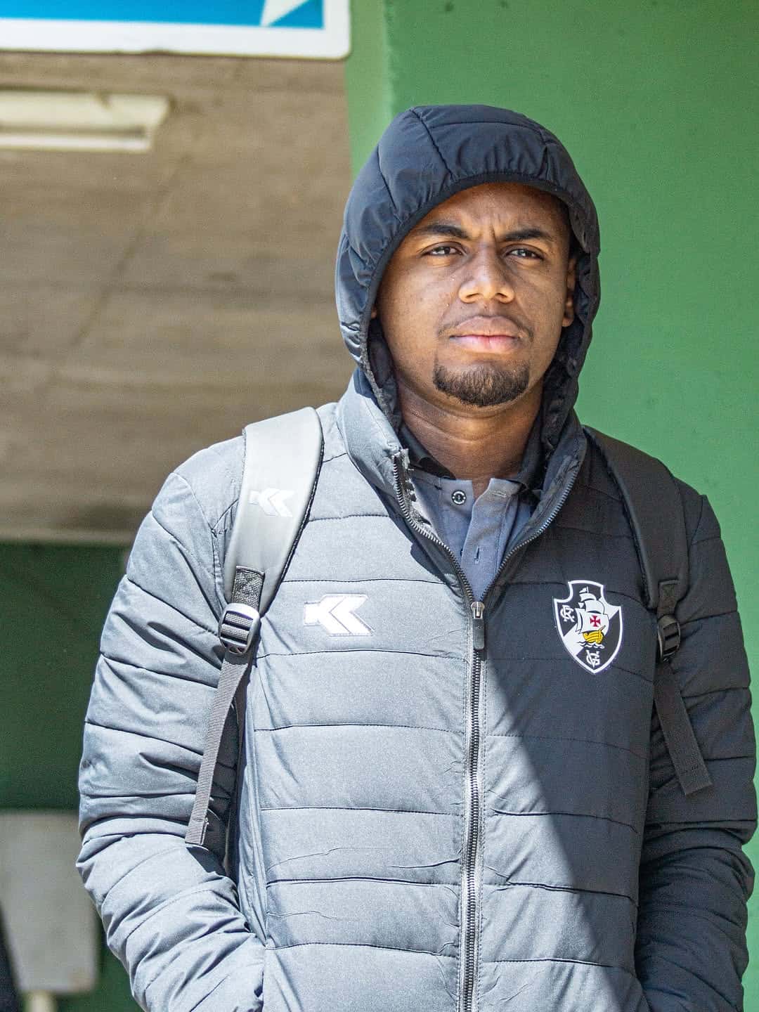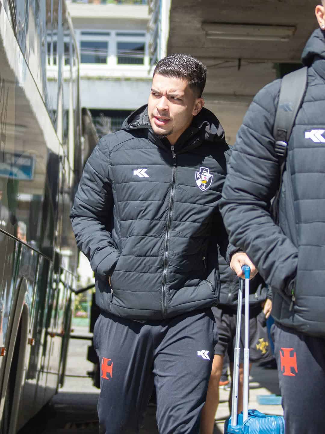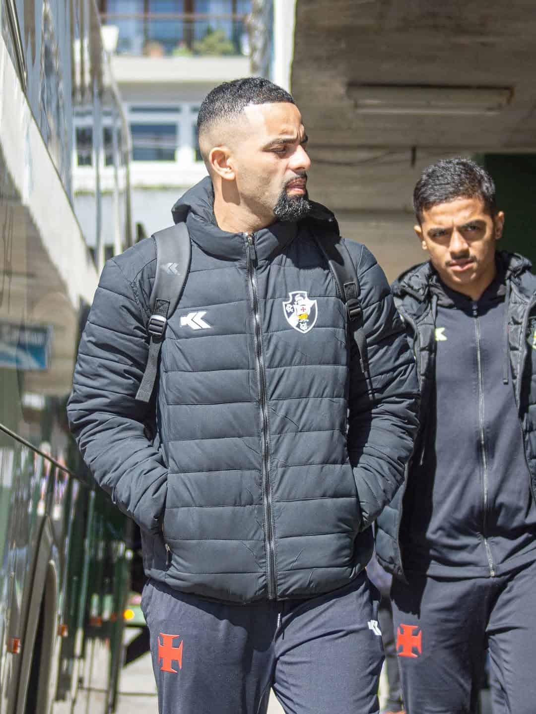 Nike kits com escudo do Vasco, dois jogadores caminhando juntos. Jovem atleta com jaqueta preta e mochila. Vestido de treino do Vasco da Gama em dias de jogo. Por favor, envie a imagem para que eu possa gerar as informações de SEO. Vasco vestindo jaqueta preta em ambiente externo. Vestido casual de jogador do Vasco, com jaqueta preta e shorts cinza. Jogador do Vasco com jaqueta preta e mochila preta. Vasca jovem com roupa esportiva e mochila preta. Vestido com jaqueta cinza e camiseta cinza, homem com capuz preto, mochila e expressão séria. Jogador do Vasco com mala de viagem. Vestuários do Vasco, dois jovens com roupas esportivas negras, um usando capuz, um deles olhando para o celular. Jaó jovem usando jaqueta preta com escudo do Vasco, mochila e carregando sacola.