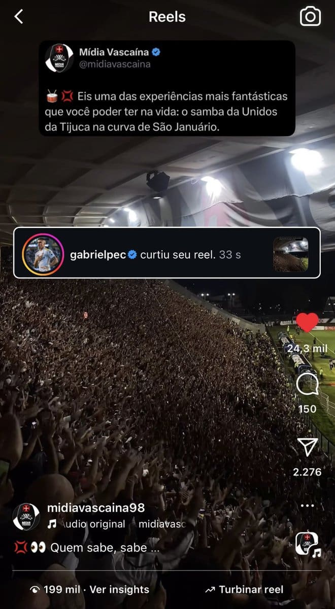 Gabriel Pec compartilha vídeo da festa da torcida em São Januário durante Vasco 3 x 1 Sport