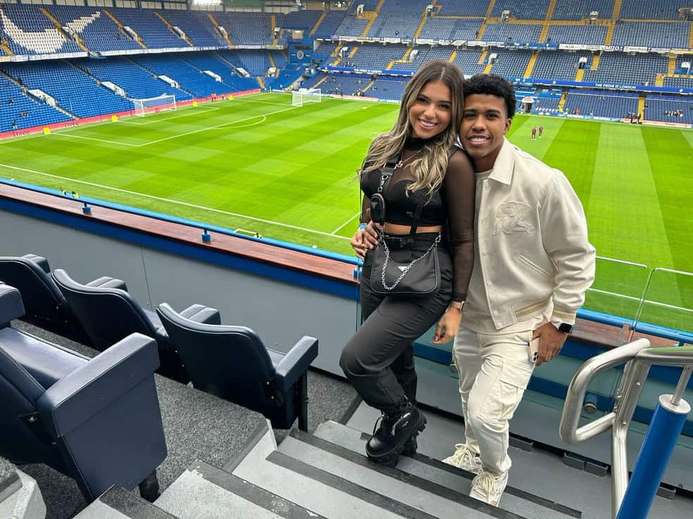 Andrey Santos com a esposa, Yngryd, no Stanford Bridge, a casa do Chelsea — Foto: Acervo pessoal