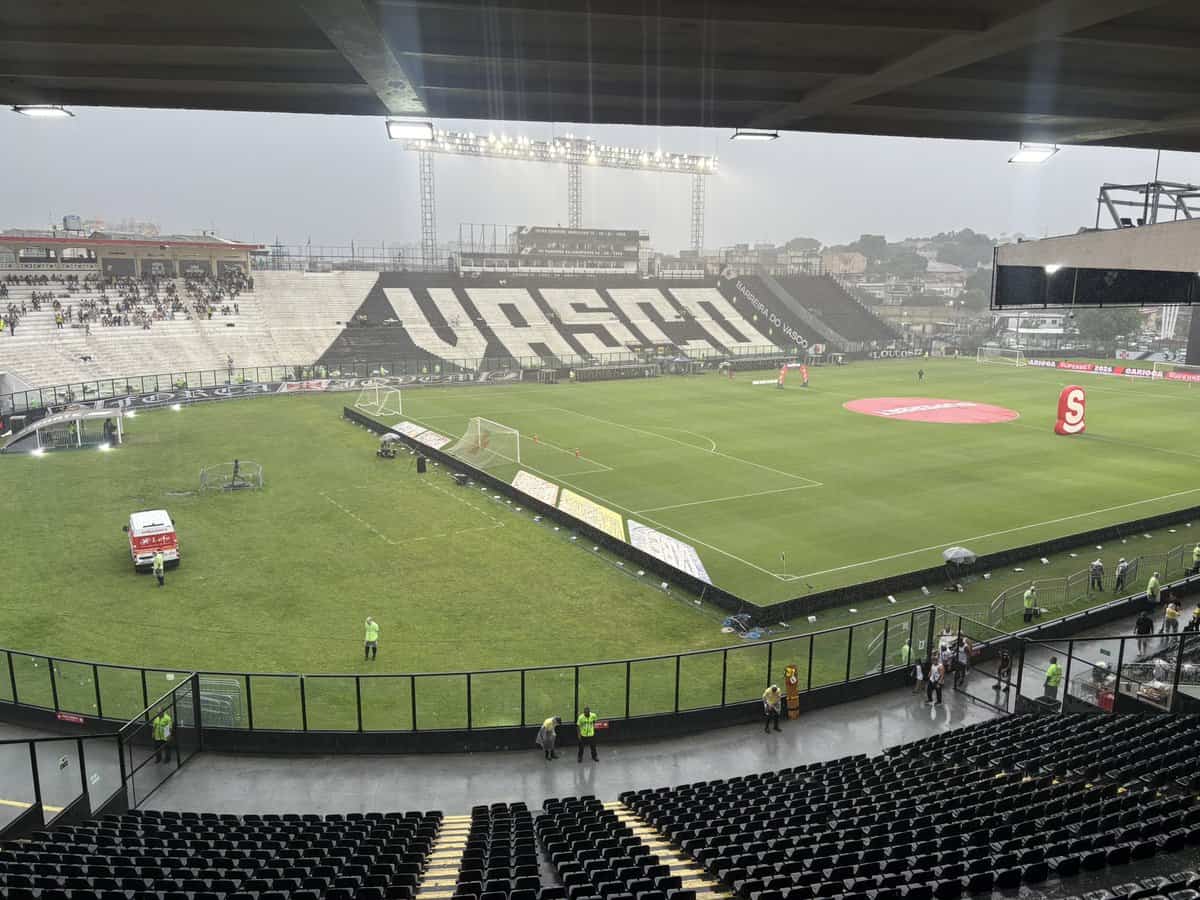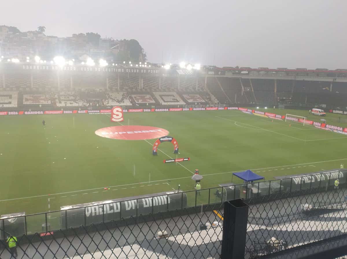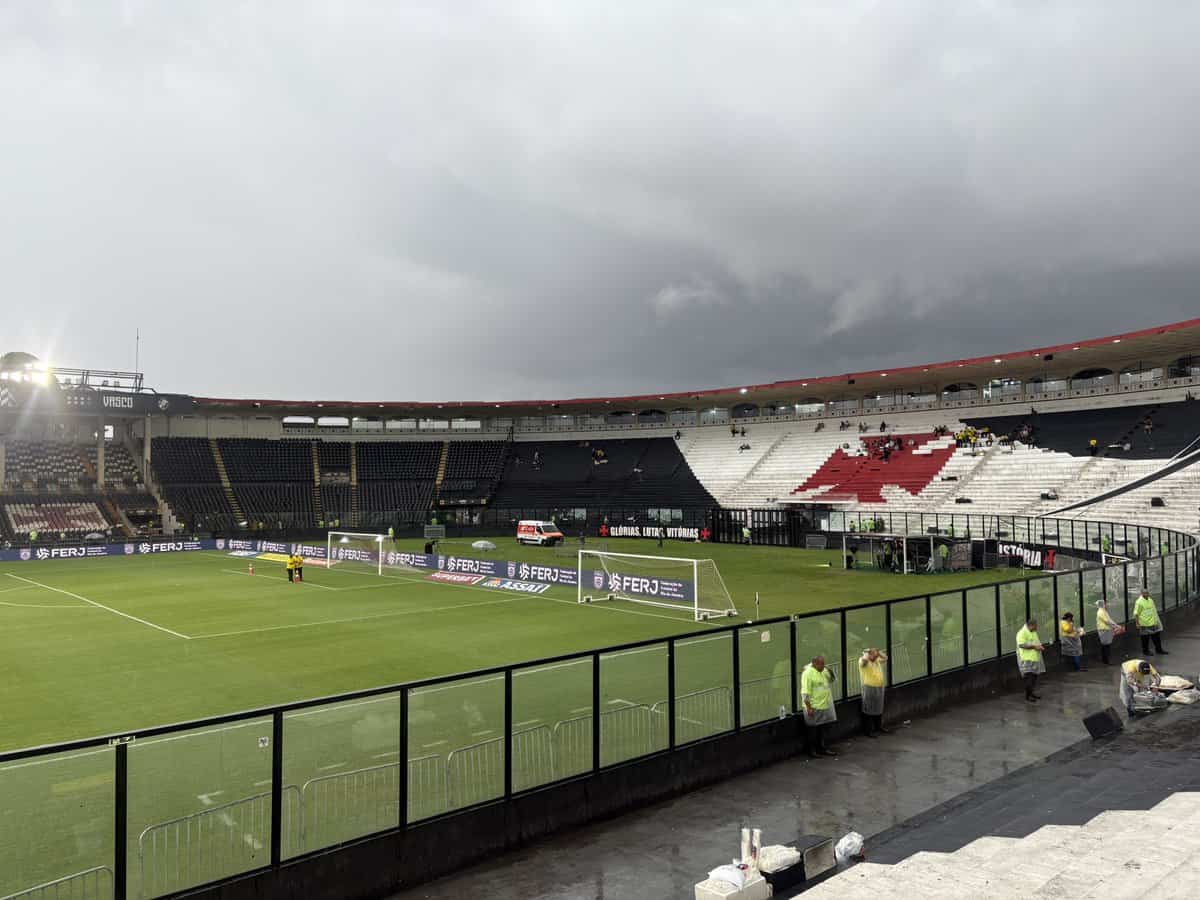 Em São Januário, torcedores se reúnem para assistir à partida entre Vasco e Botafogo, que definirá as quartas de final do Campeonato Carioca. A recomendação é levar capa de chuva devido às condições climáticas.