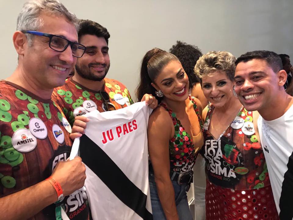2018: Presidente Alexandre Campello vai a evento da Grande Rio e dá camisa personalizada para a vascaína Juliana Paes, rainha de bateria da escola