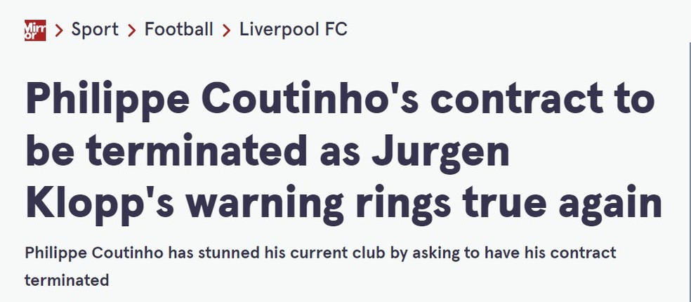 O “Mirror” destacou a situação com a manchete “Philippe Coutinho ficará sem contrato e conselho de Jürgen Klopp mostra mais uma vez ser verdadeiro”.