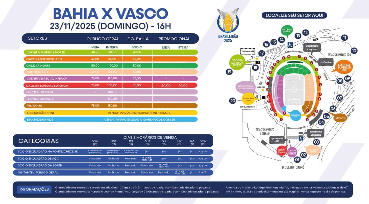 No domingo, dia 23/11, às 16h, acontece o grande confronto entre Bahia e Vasco. Fique por dentro dos detalhes da venda de ingressos: