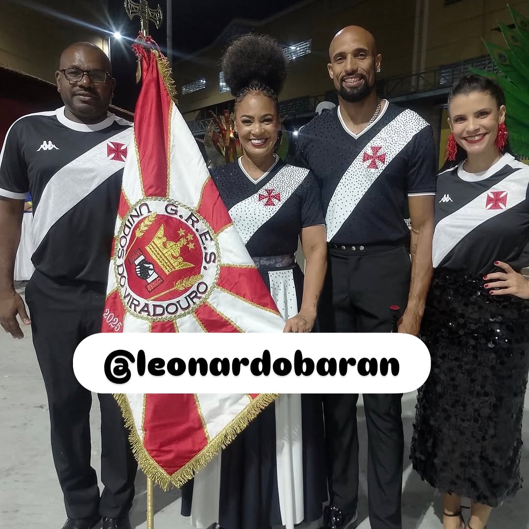 Na imagem, Rute e Julinho, o casal de mestre-sala e porta-bandeira, estão elegantemente vestidos com as cores do Vasco.