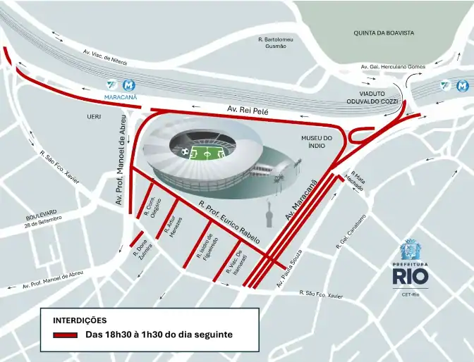 - Avenida Maracanã, ambos os sentidos, entre a rua São Francisco Xavier e a avenida Rei Pelé.
