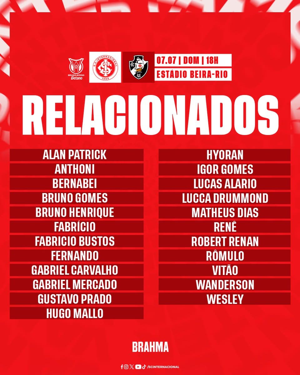 📝 Lista dos jogadores selecionados para o embate contra o Vasco.