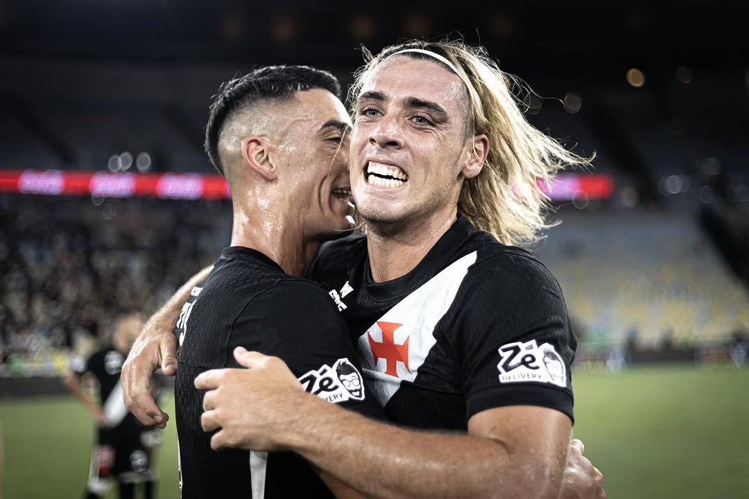 Jogadores do Vasco comemoram vitória de virada contra o Fluminense junto à torcida.