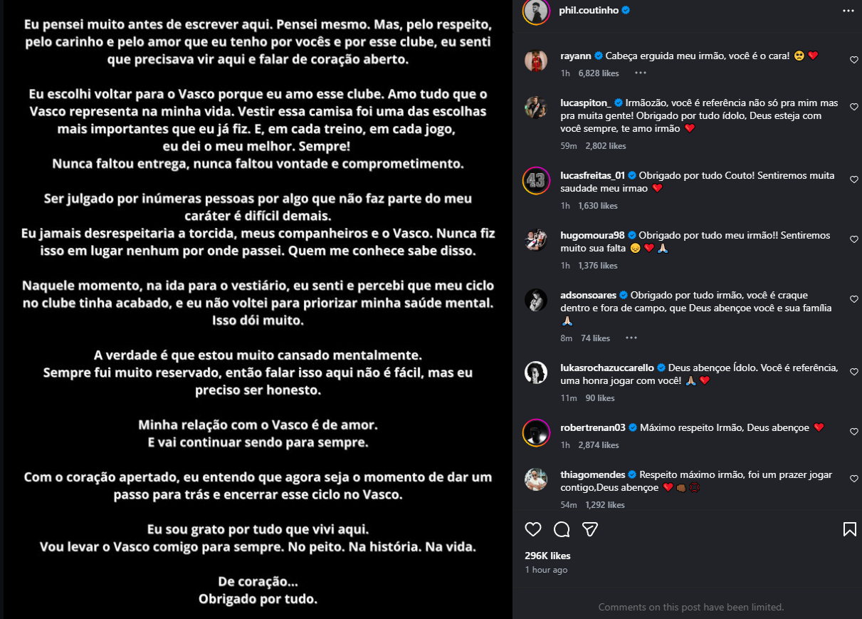 Jogadores do Vasco deixam recados para Philippe Coutinho no Instagram