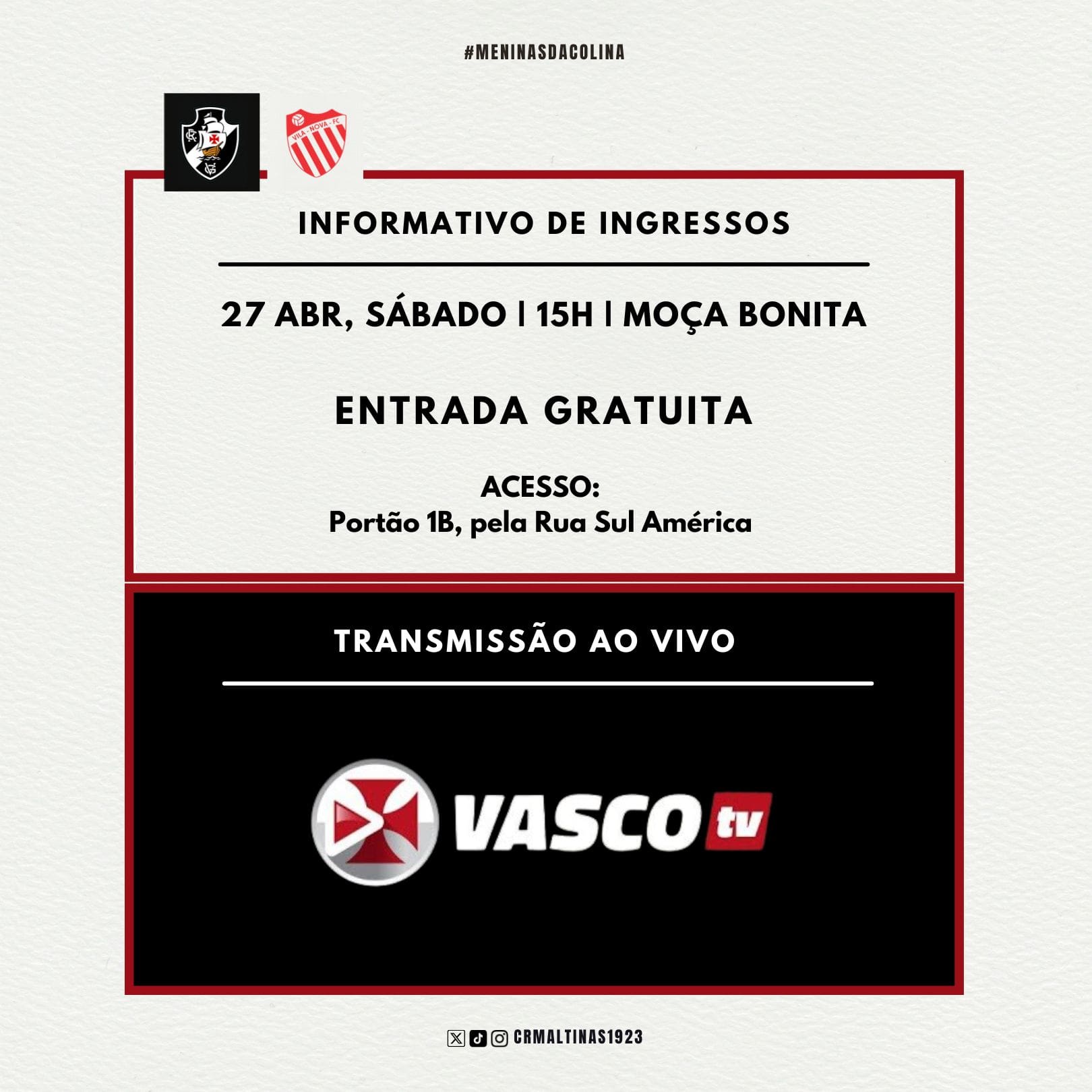 | Entradas e exibição do confronto de Vasco x Vila Nova/ES, pela etapa inicial do Brasileirão A3, em Bangu. Prestigie e apoie as ! Imagem: torcedoras 1923/reprodução