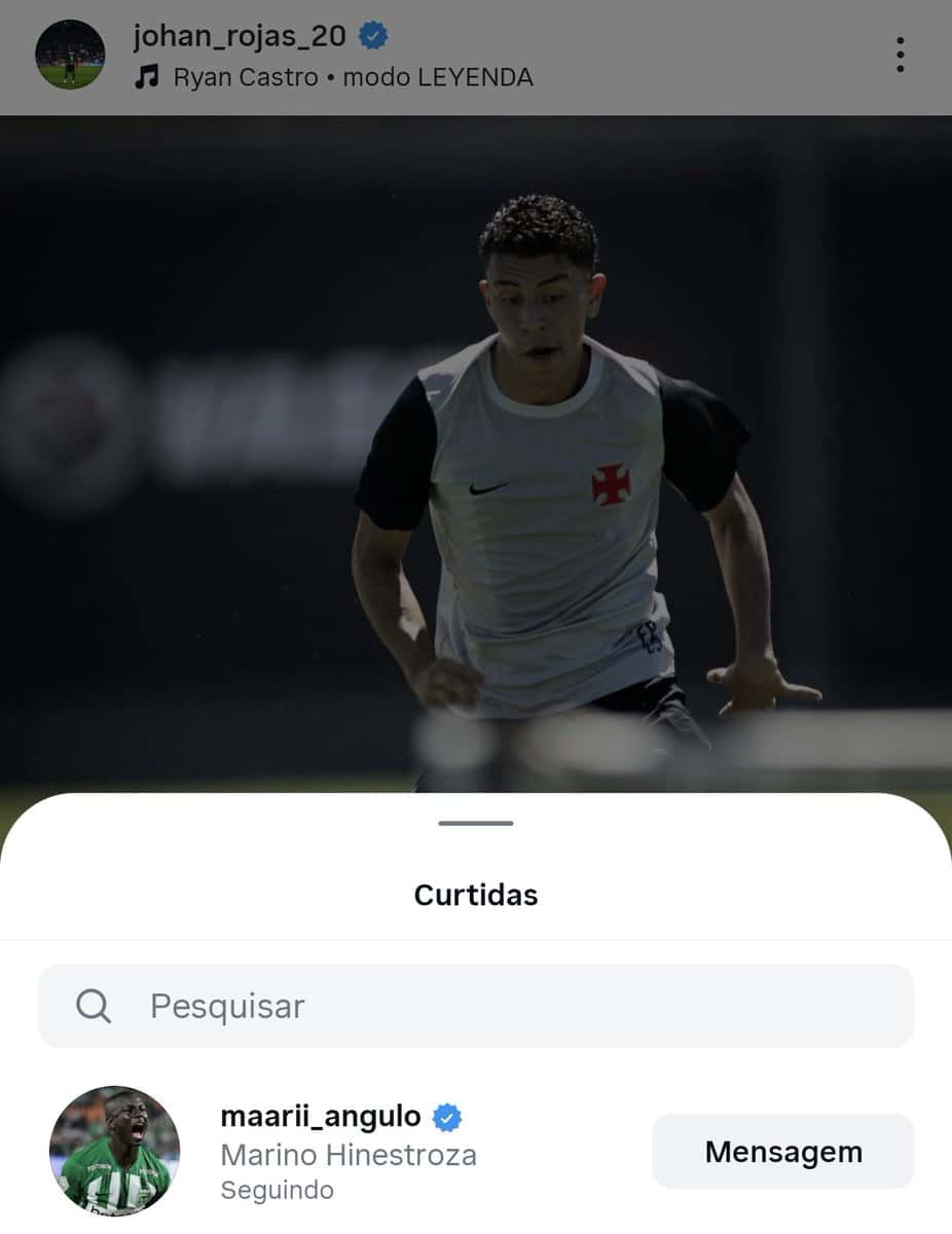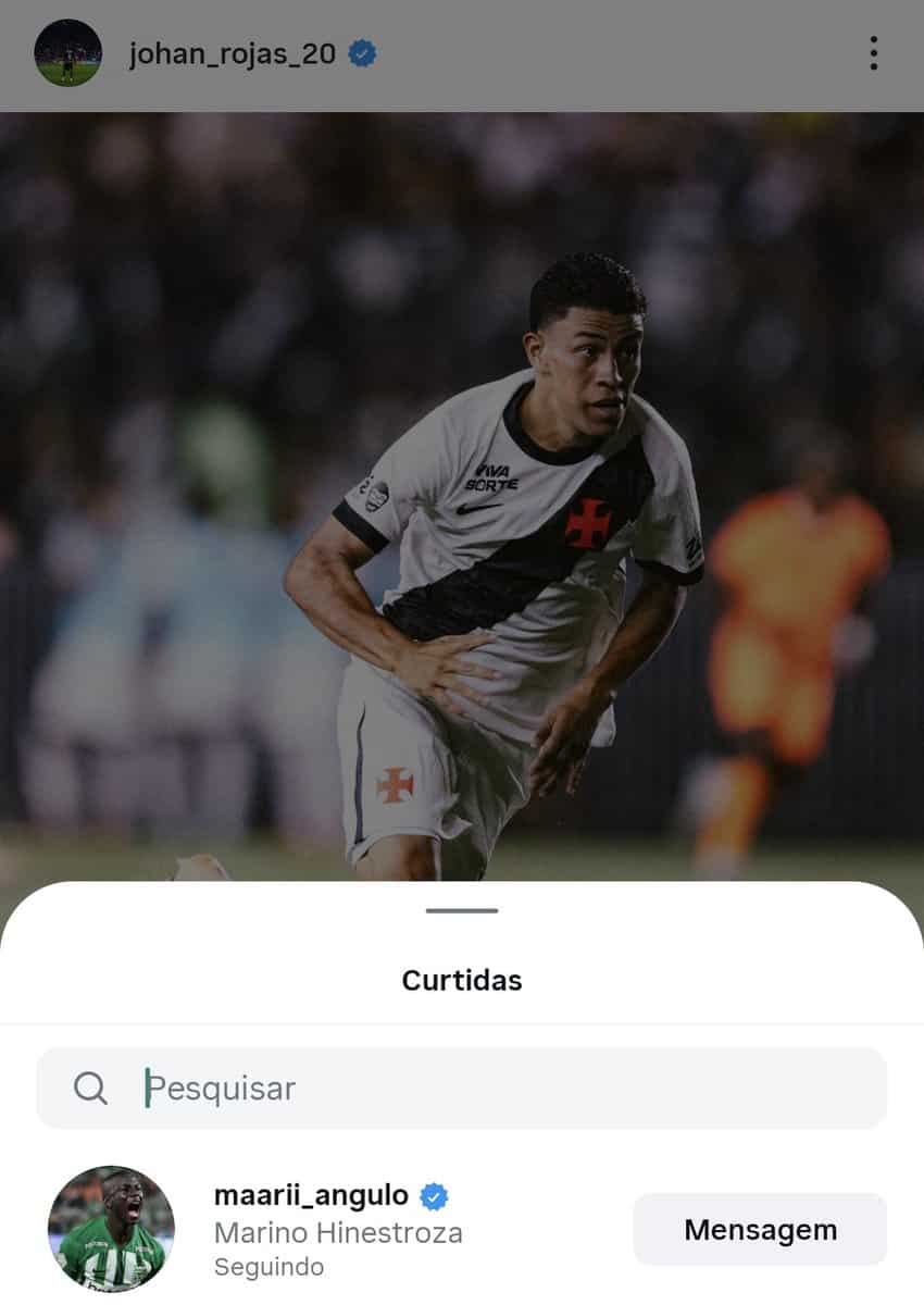 Johan Rojas teve suas duas últimas fotos curtidas por Hinestroza, gerando especulações sobre a relação entre os jogadores do Vasco da Gama.
