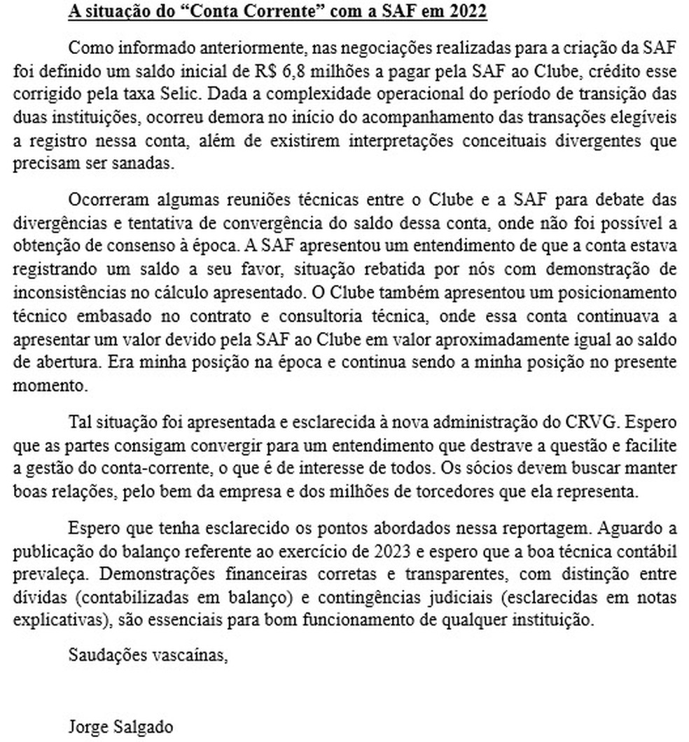 O ex-líder do Vasco, Jorge Salgado, emitiu um comunicado ao portal ge sobre o relatório financeiro de 2023 que será divulgado pela administração Pedrinho nesta terça-feira. Salgado contesta as informações divulgadas na semana passada, referentes ao levantamento feito pelo atual corpo diretivo sobre a elevação para cerca de R$ 200 milhões de passivos que Salgado classificava como “ocultos”.