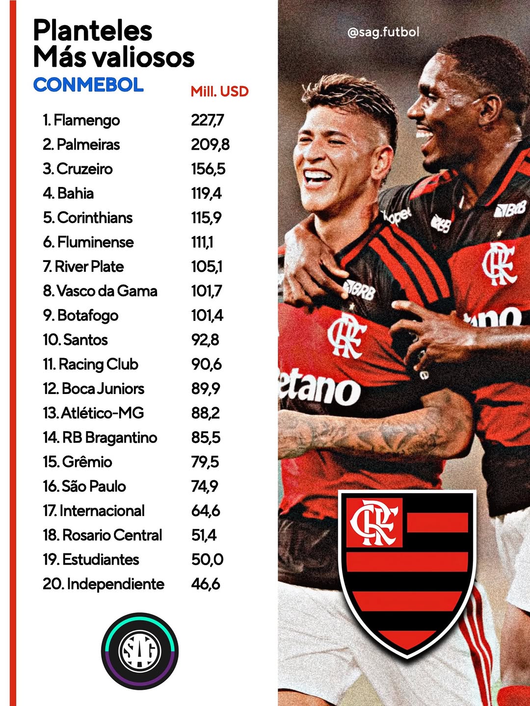 💵🌎 Os 20 clubes com os elencos mais valiosos da CONMEBOL
