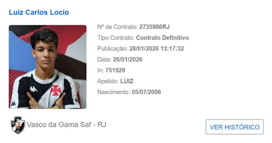 Lócio teve seu novo contrato registrado no BID, reforçando a equipe Sub-20 do Vasco da Gama para a temporada.