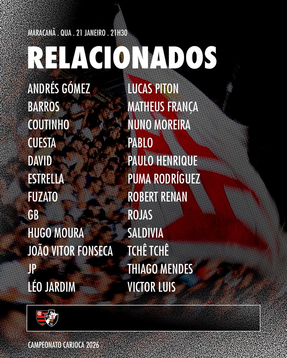 O Vasco da Gama divulgou a lista de jogadores para o confronto contra o Urubu, com a ausência do atleta Lucas Freitas.