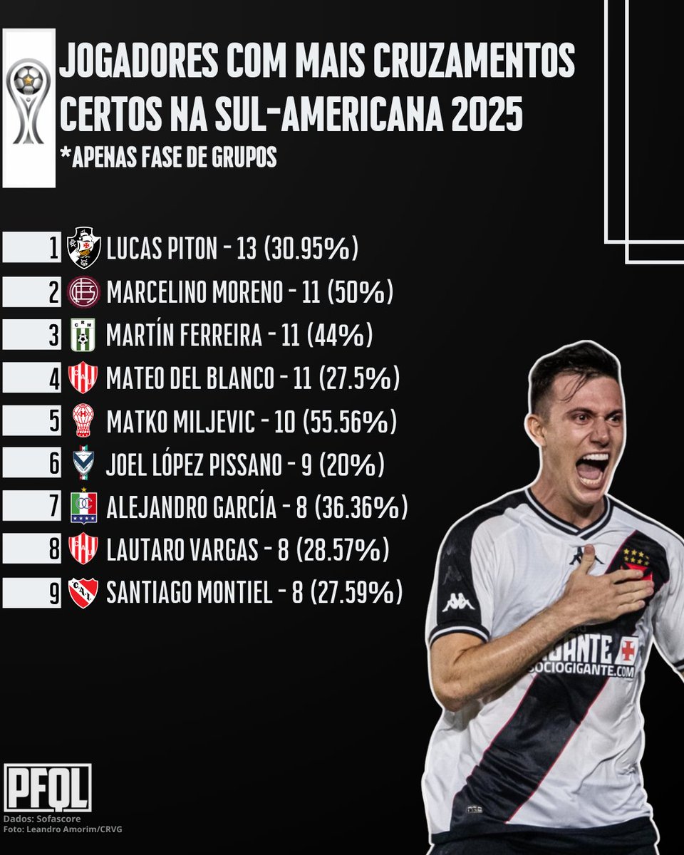 💢 A Copa Sul-Americana está em andamento, chegando à fase de play-offs. Vamos conferir uma estatística interessante: durante a fase de grupos, Lucas Piton, jogador do Vasco, destacou-se por ser o atleta com o maior número de cruzamentos bem-sucedidos – 13 ao total, representando 30,95% de acertos nas suas tentativas.